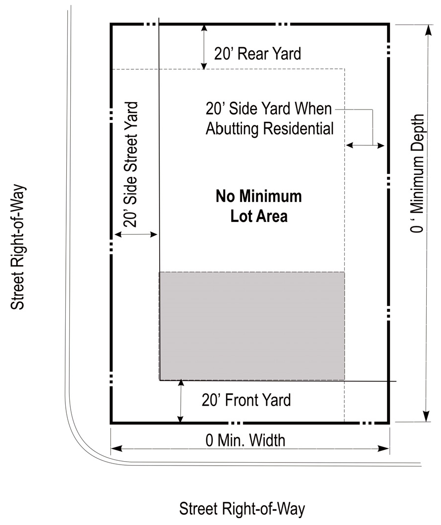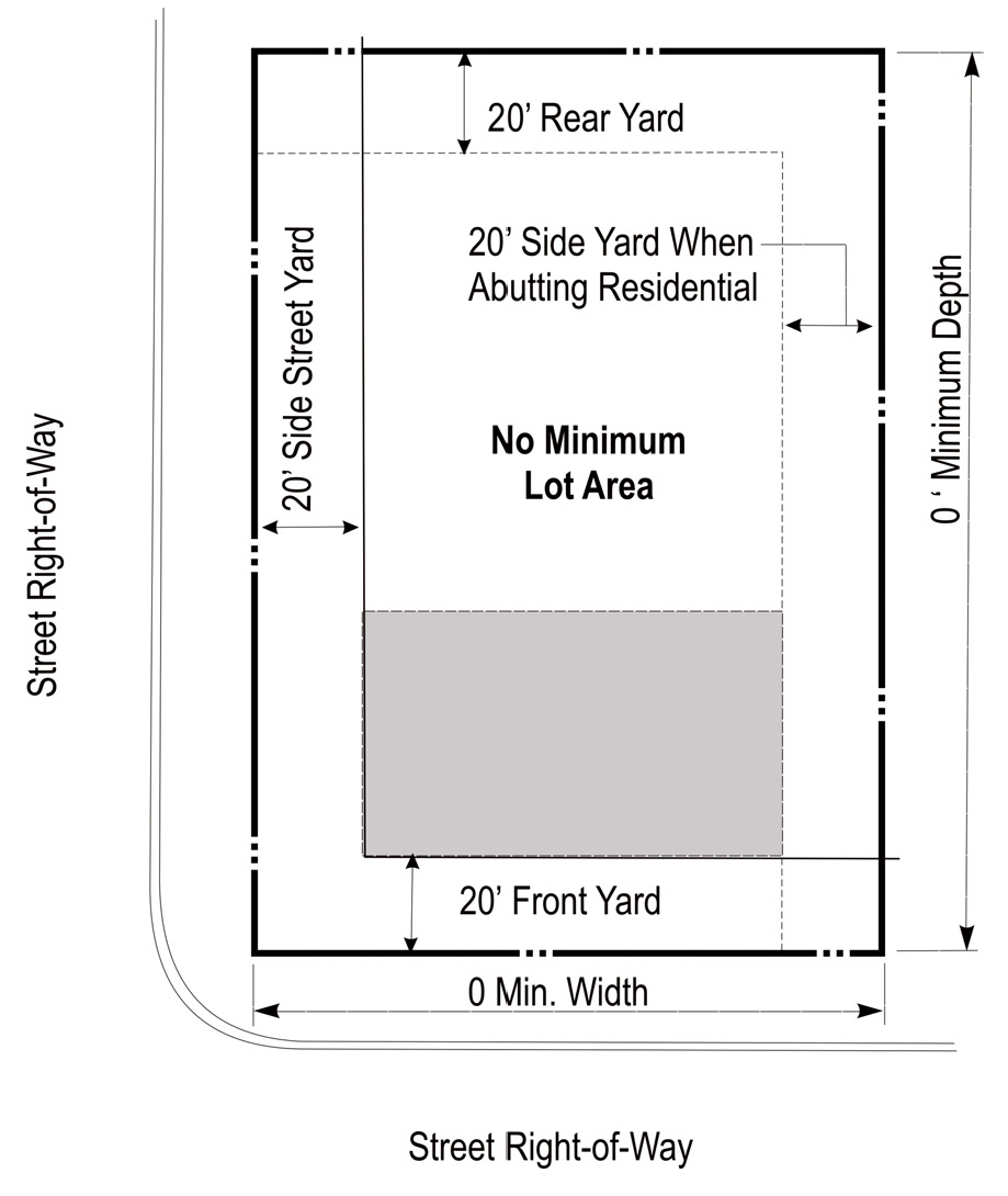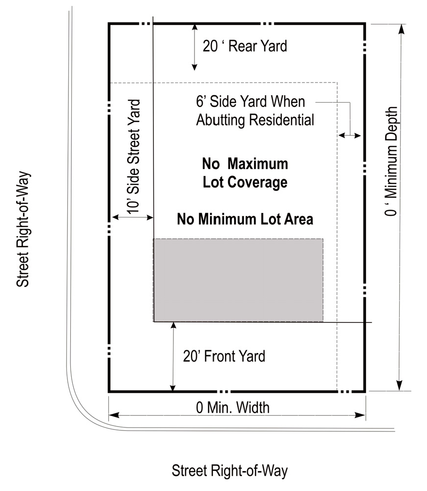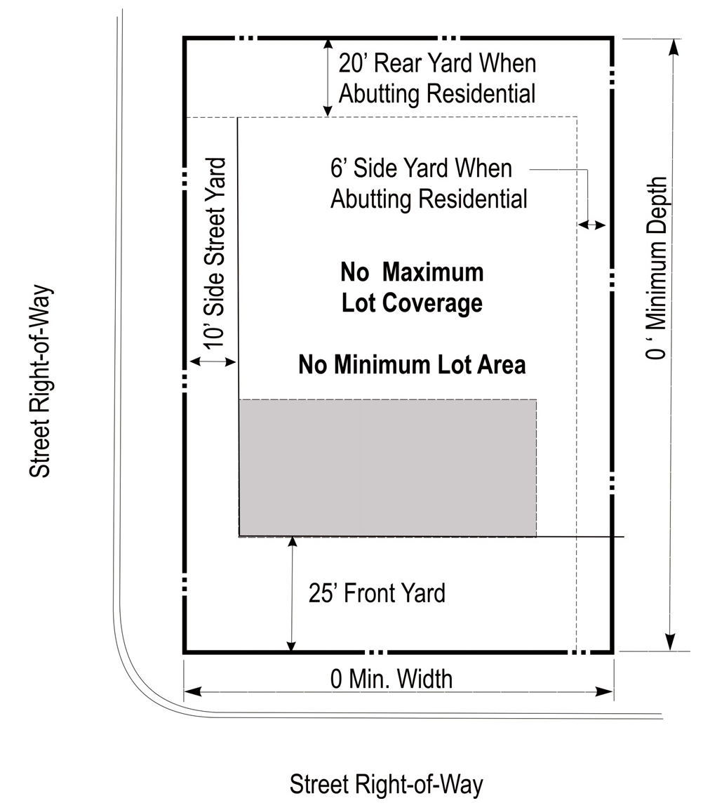 DENSITY, AREA, YARD, HEIGHT, AND LOT COVERAGE REQUIREMENTS: The requirements regulating the minimum lot size, minimum yard size (front, side, and rear), maximum building height (stories and feet), and maximum lot coverage, and minimum floor area, as it pertains to this district, shall conform with the provisions provided in the area requirements table for the C zoning district (below).