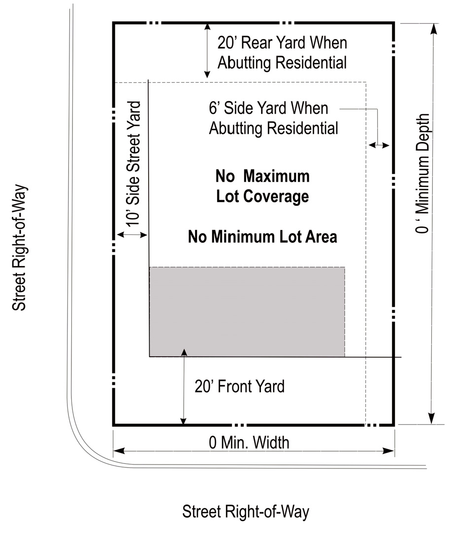 DENSITY, AREA, YARD, HEIGHT, AND LOT COVERAGE REQUIREMENTS: The requirements regulating the minimum lot size, minimum yard size (front, side, and rear), maximum building height (stories and feet), and maximum lot coverage, and minimum floor area, as it pertains to this district, shall conform with the provisions provided in the area requirements table for the LB zoning district (below).