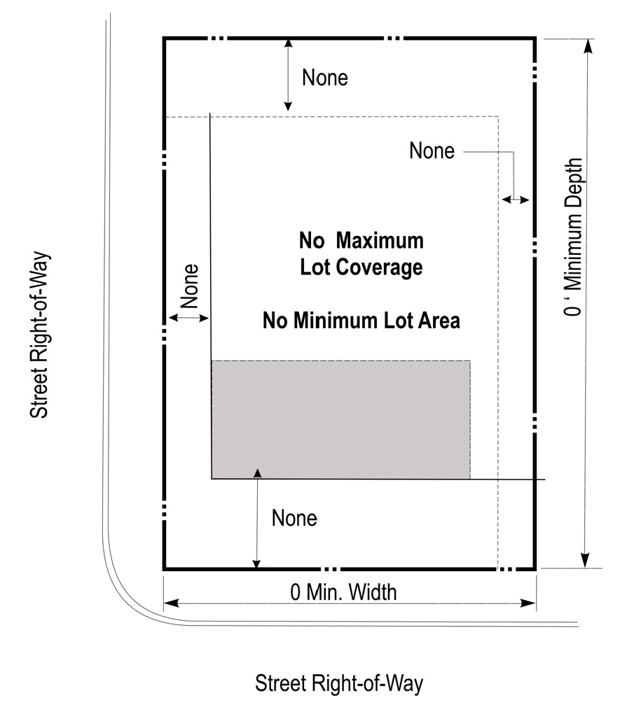 DENSITY, AREA, YARD, HEIGHT, AND LOT COVERAGE REQUIREMENTS: The requirements regulating the minimum lot size, minimum yard size (front, side, and rear), maximum building height (stories and feet), and maximum lot coverage, and minimum floor area, as it pertains to this district, shall conform with the provisions provided in the area requirements table for the CBD zoning district (below).