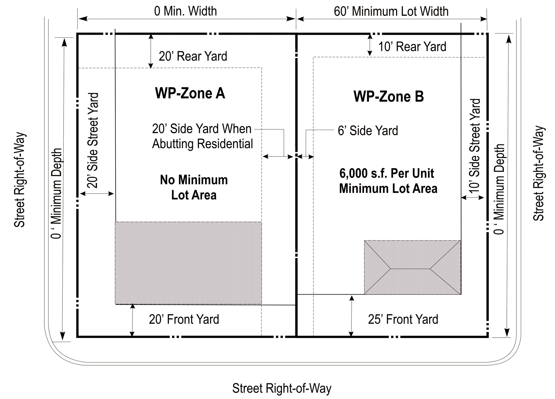 DENSITY, AREA, YARD, HEIGHT, AND LOT COVERAGE REQUIREMENTS: The requirements regulating the minimum lot size, minimum yard size (front, side, and rear), maximum building height (stories and feet), and maximum lot coverage, and minimum floor area, as it pertains to this district, shall conform with the provisions provided in the area requirements table for the WP zoning district.