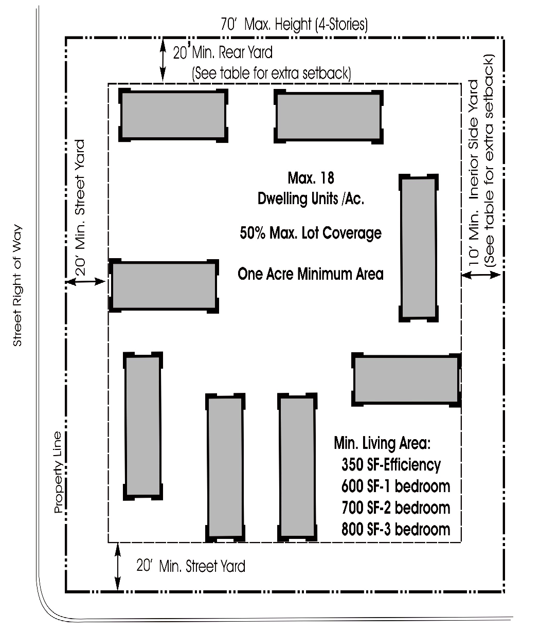 GENERAL PURPOSE AND DESCRIPTION: The MD moderate density residential district is established to provide flexibility for residential density without providing for high density multi-family residential units. The product of this district may be two, three family, or four attached units on a single lot. As presented in the comprehensive land use plan, the MD district may be suitable as a buffer zone between single-family and higher intensity uses.