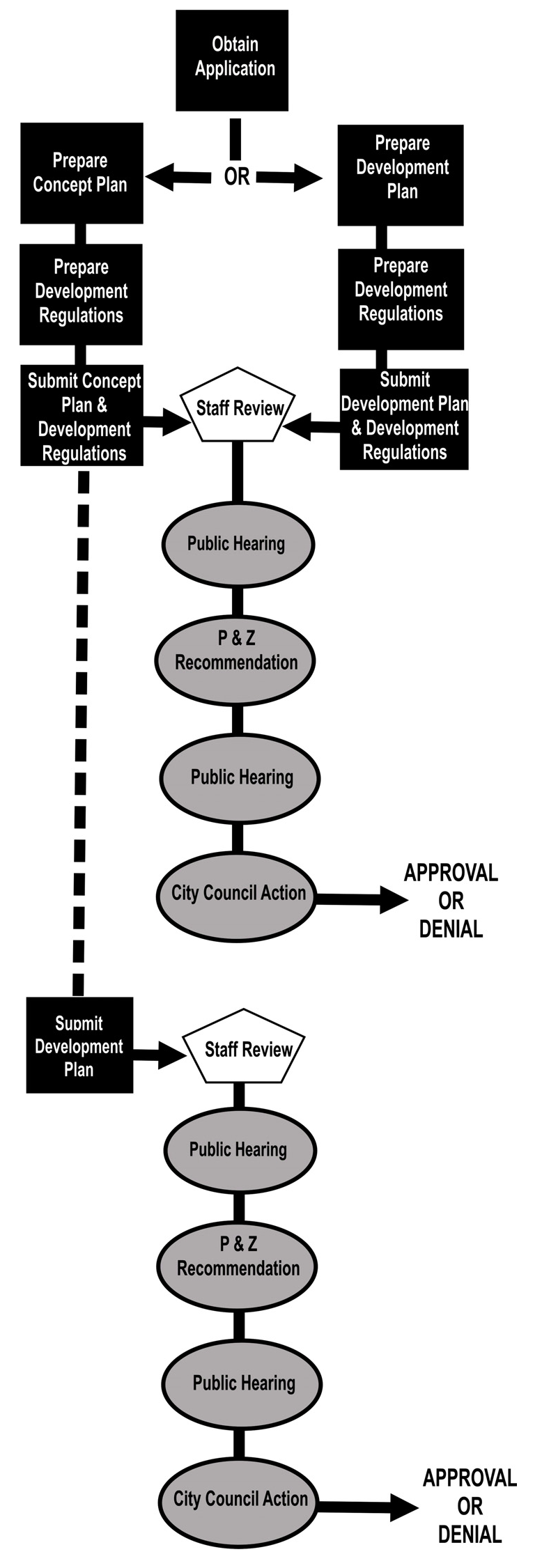 CONCEPT AND DEVELOPMENT PLAN: In establishing a planned development district, the city council shall approve and file as part of the amending ordinance appropriate plans and standards for each planned development district. During the review and public hearing process, the city council shall require a concept plan and/or a development plan (or detail site plan) in accordance with these regulations.