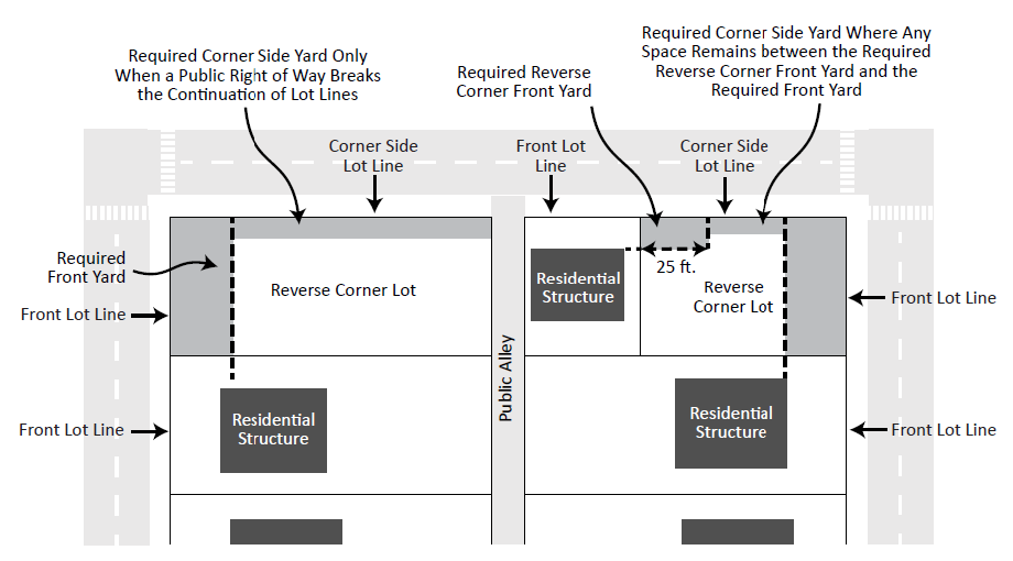 On a reverse corner lot, both lot lines that abut the street shall be considered front lot lines. The required front yard shall be provided and maintained along the front lot line aligned with the original platting orientation of the parcel, and the reverse corner front yard shall not be less than the established front yard of the closest principal building originally designed for residential purposes located on the same block face for the first twenty-five (25) feet from a shared property line, as shown in Figure 540-1. Reverse corner front yard setbacks shall not be applied when crossing an alley or other public right-of-way. This section does not authorize a reverse corner front yard that is less than the minimum corner side yard requirement.