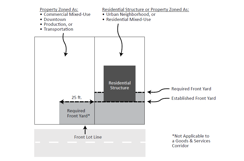 Where a street frontage includes an adjacent structure used only for permitted or conditional residential purposes in a commercial mixed-use, downtown, production and transportation district, a front yard equal to the lesser of the front yard required by the district or the established front yard of such residential structure shall be provided in the commercial mixed-use, downtown, production and transportation district for the first twenty-five (25) feet from such residential property as shown in Figure 540-2.