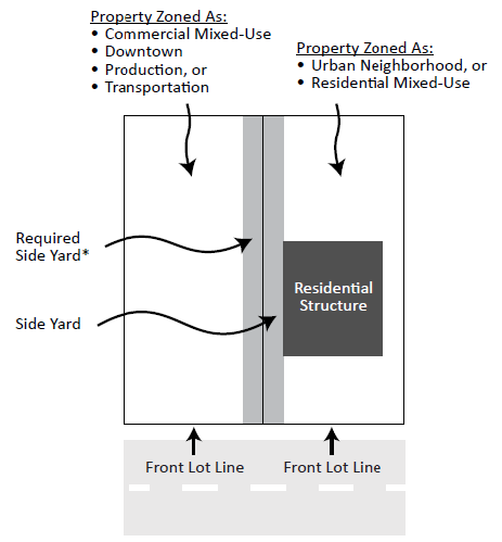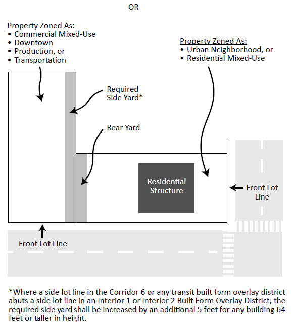 Where a side lot line abuts a side or rear lot line in an urban neighborhood or residential mixed-use district, then the applicable side yard requirements of the adjacent district shall apply as shown in Figure 540-3. Where a side lot line in the BFC6 Corridor 6 Built Form Overlay District or any transit built form overlay district abuts a side lot line in the BFI1 Interior 1 or BFI2 Interior 2 Built Form Overlay District, the required interior side yard shall be increased by an additional five (5) feet for any building sixty-four (64) feet or taller in height.