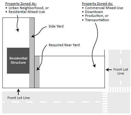 Where a rear lot line abuts a commercial mixed-use, downtown, production and transportation zoning district, no minimum rear yard shall apply, except that a structure shall not be constructed within ten (10) feet of a window facing the shared lot line and serving a residential use on the adjacent property as shown in Figure 540-4. In such instance where the adjacent use includes a residential window within ten (10) feet of the side lot line, the ten (10) feet clearance shall also be open to the sky without obstruction above.