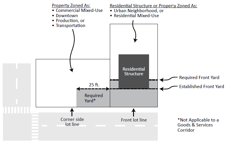 Reverse corner side yard requirements. Where the extension of a corner side lot line coincides with a front lot line in an adjacent urban neighborhood or residential mixed-use district, or with a front lot line of a structure used only for permitted or conditional residential purposes, a yard equal to the lesser of the front yard required by such urban neighborhood or residential mixed-use district or the established front yard of such residential structure shall be provided along such side lot line for the first twenty-five (25) feet from such urban neighborhood or residential mixed-use district boundary or residential property, as shown in Figure 540-6. Such front yard requirement in commercial mixed-use, downtown, production and transportation districts shall not apply where the front lot line abuts a goods and services corridor.