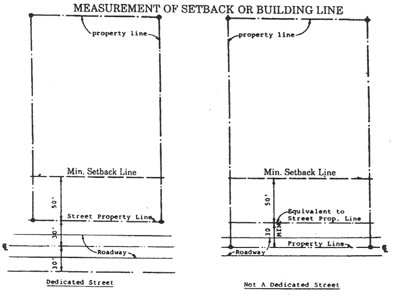 Measurement of Setback or Building Line. Setbacks or front or side street building lines or other applicable elements required by this Ordinance, shall be measured from a street property line as such term is defined in Article 2. When a street or roadway is established by some method other than dedication by recording a subdivision plat, setbacks or front or side street building lines, or other related elements required by this Ordinance, shall be measured from a line that is equivalent to the street property line on such a dedicated street. Such equivalent line shall be located a minimum of thirty (30) feet from the centerline of the street or roadway.
