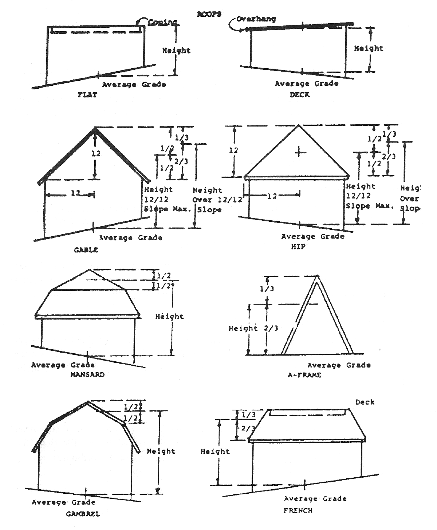 The heights of buildings shall be measured in the manner as provided in the drawing, entitled "Measurement of Building Heights," shown below.