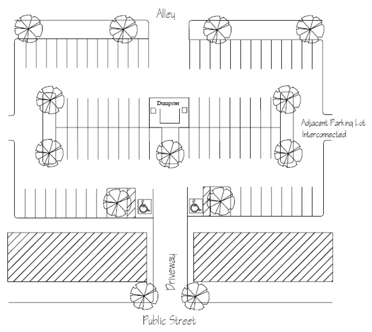 Off-street parking areas shall be designed to facilitate adequate movement and access by sanitation, emergency, and other public service vehicles without posing a danger to pedestrians or impeding the function of the parking area.
