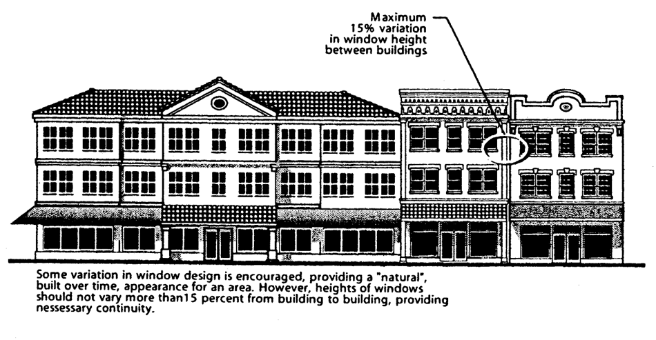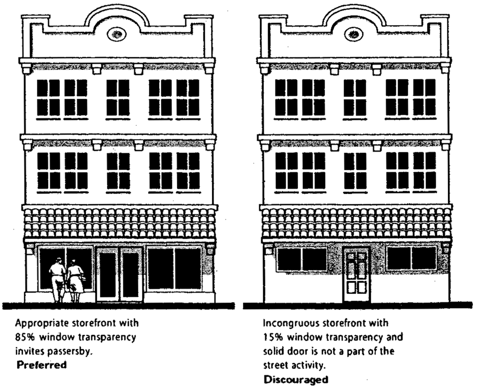 712.7.1.5. Buildings shall reinforce and revitalize streets and public spaces, by providing an ordered variety of entries, windows, bays, and balconies along public ways. Ground floors shall have a high degree of transparency to encourage interaction between sidewalk activity and uses within the building. Buildings shall have human scale in details and massing.