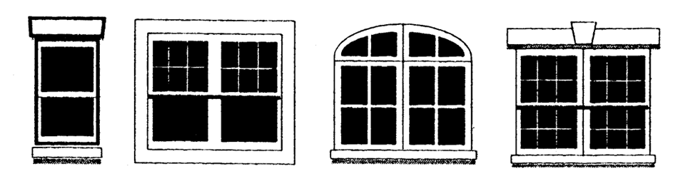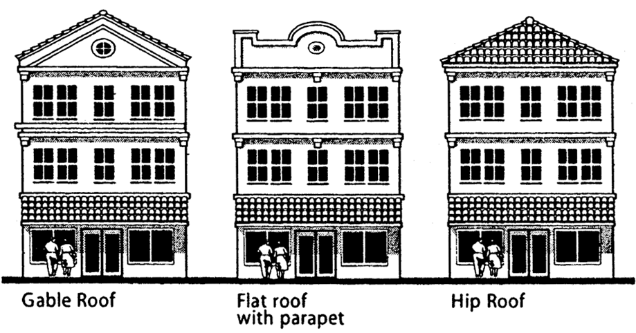 (b) roof overhangs with brackets, (c) stepped parapets, (d) richly textured materials