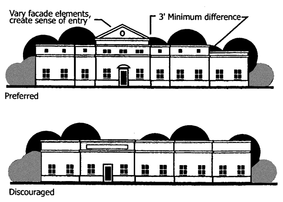 712.7.2.1. Vary massing of large buildings. A single, dominant building mass shall be avoided. Substantial variations in massing
