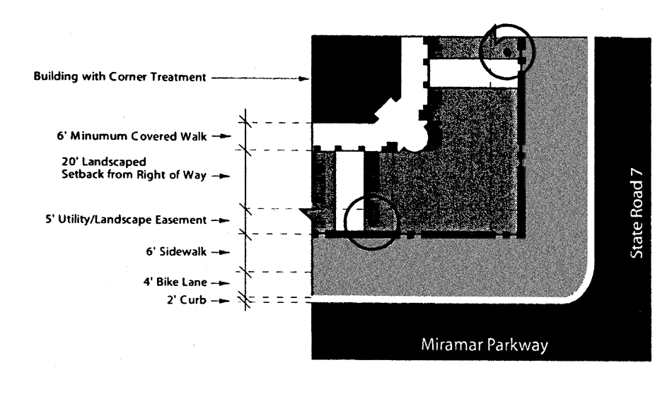 712.7.1.4. Buildings at street corners, having at least two facades exposed to a primary street, defined as State Road 7, Miramar Parkway, Pembroke Road, County Line Road, SW 25th Street and SW 33rd Street, shall be considered significant structures and shall be designed with additional height and architectural embellishments such as corner towers to emphasize their location.