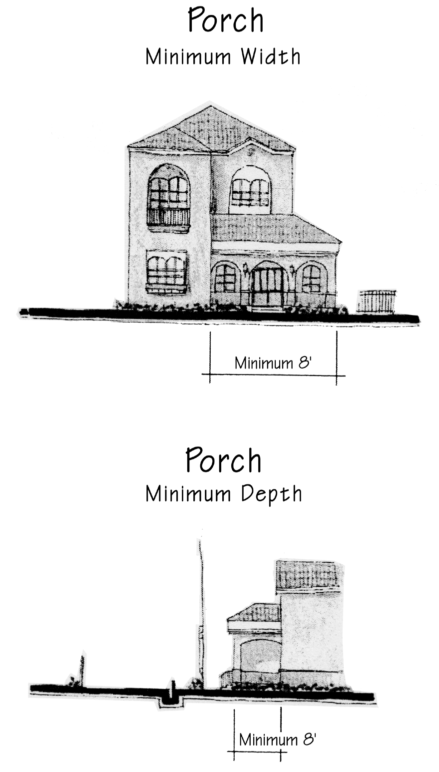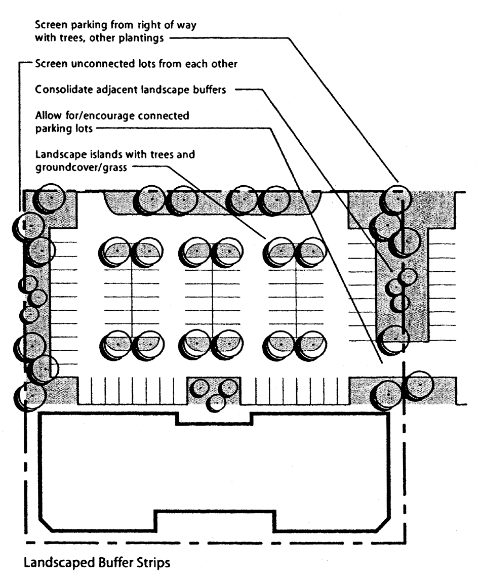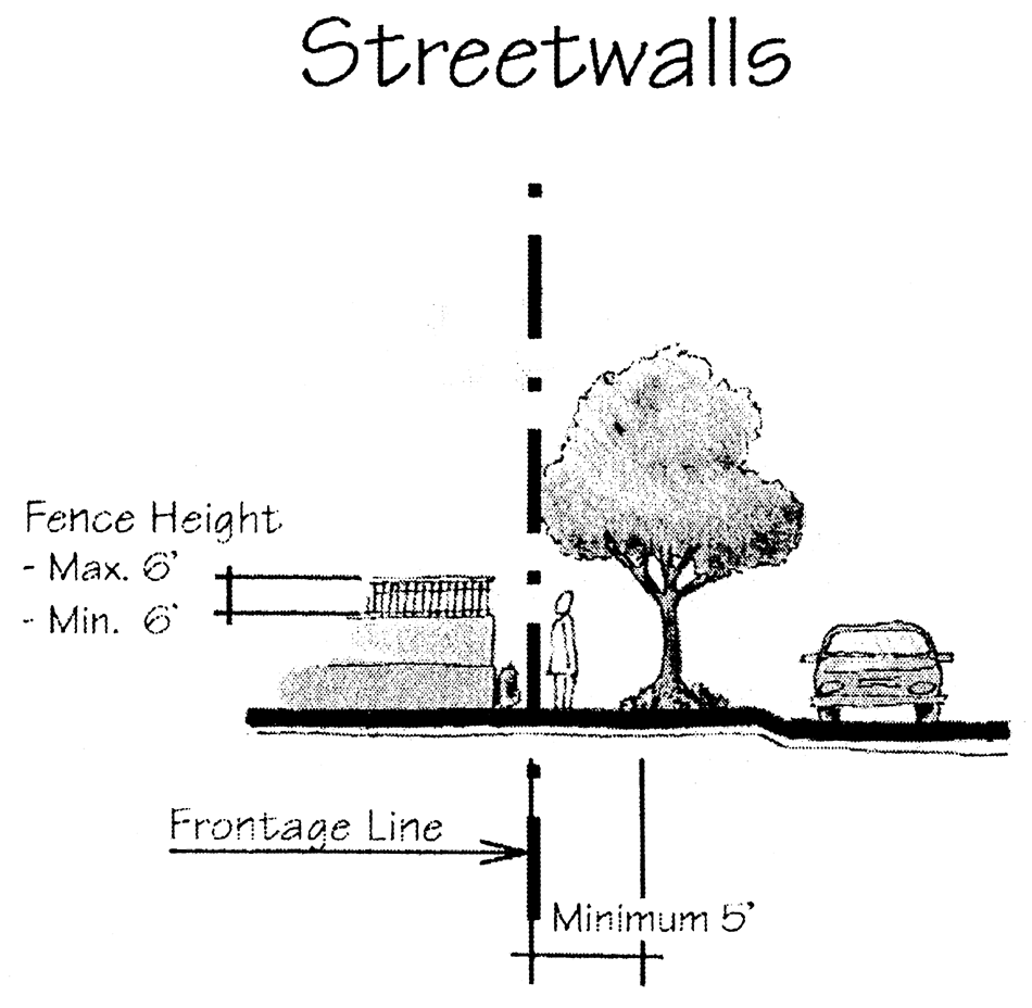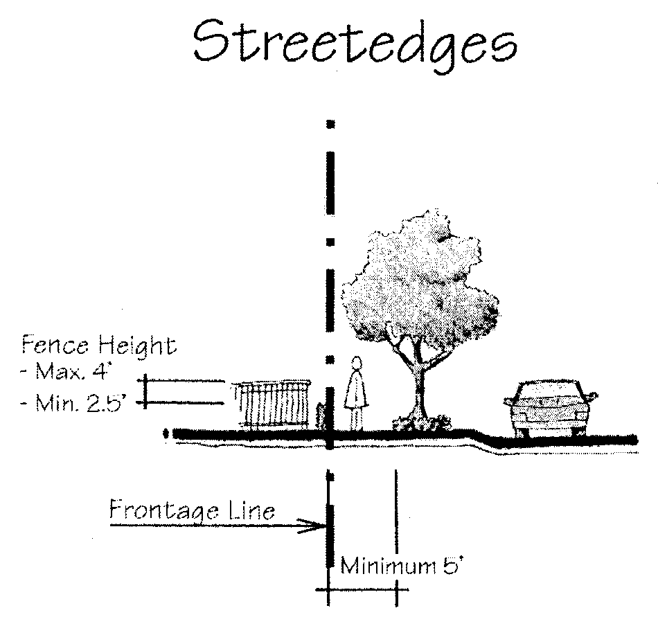 Landscaping and irrigation—Minimum five-foot landscape buffer from nearest edge of sidewalk to fence shall be required. Low shrubs between sidewalk and hedge on street front shall be provided. Hedges in front of fences shall be maintained at a minimum of 42 inches in height. A minimum three feet side yard landscape buffer inside of fence with hedge is required. Duplication of side yard fences and hedge is not required for adjacent property. All unnecessary paving on-site shall be converted to green space. Shade trees shall be required in all landscape areas with a dimension of six by six feet or greater, otherwise small trees shall be provided. All landscaping shall have 100 percent coverage for irrigation.