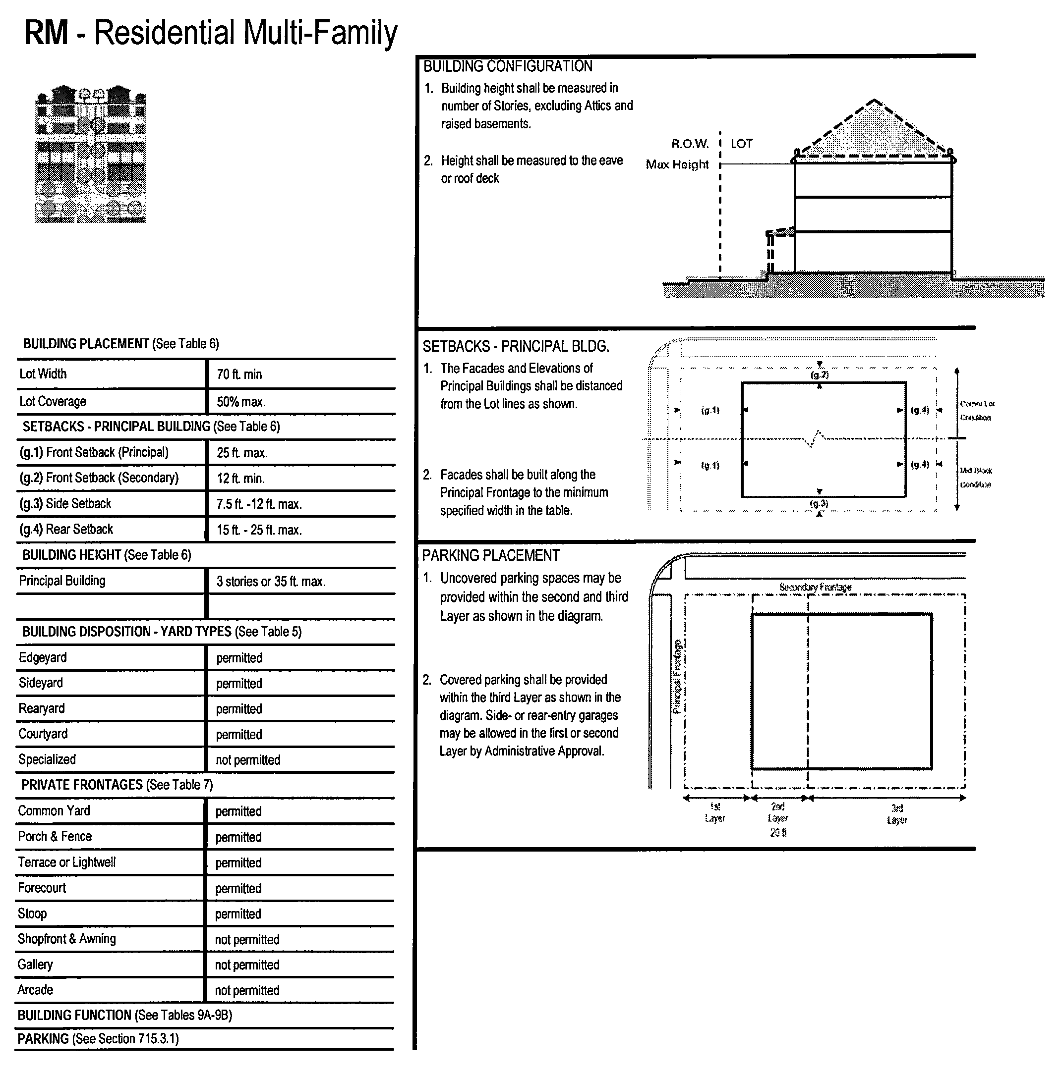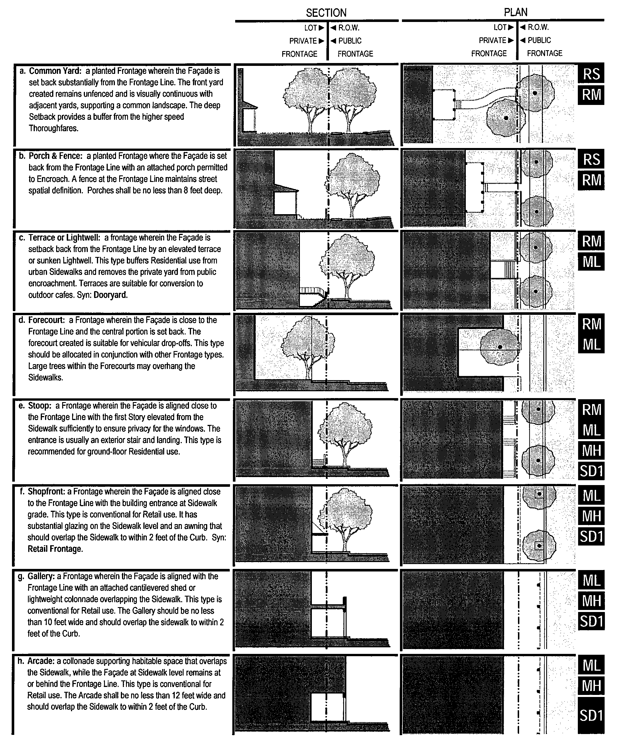 Table 7: Private Frontages. The private frontage is the area between the building facades and the lot lines.