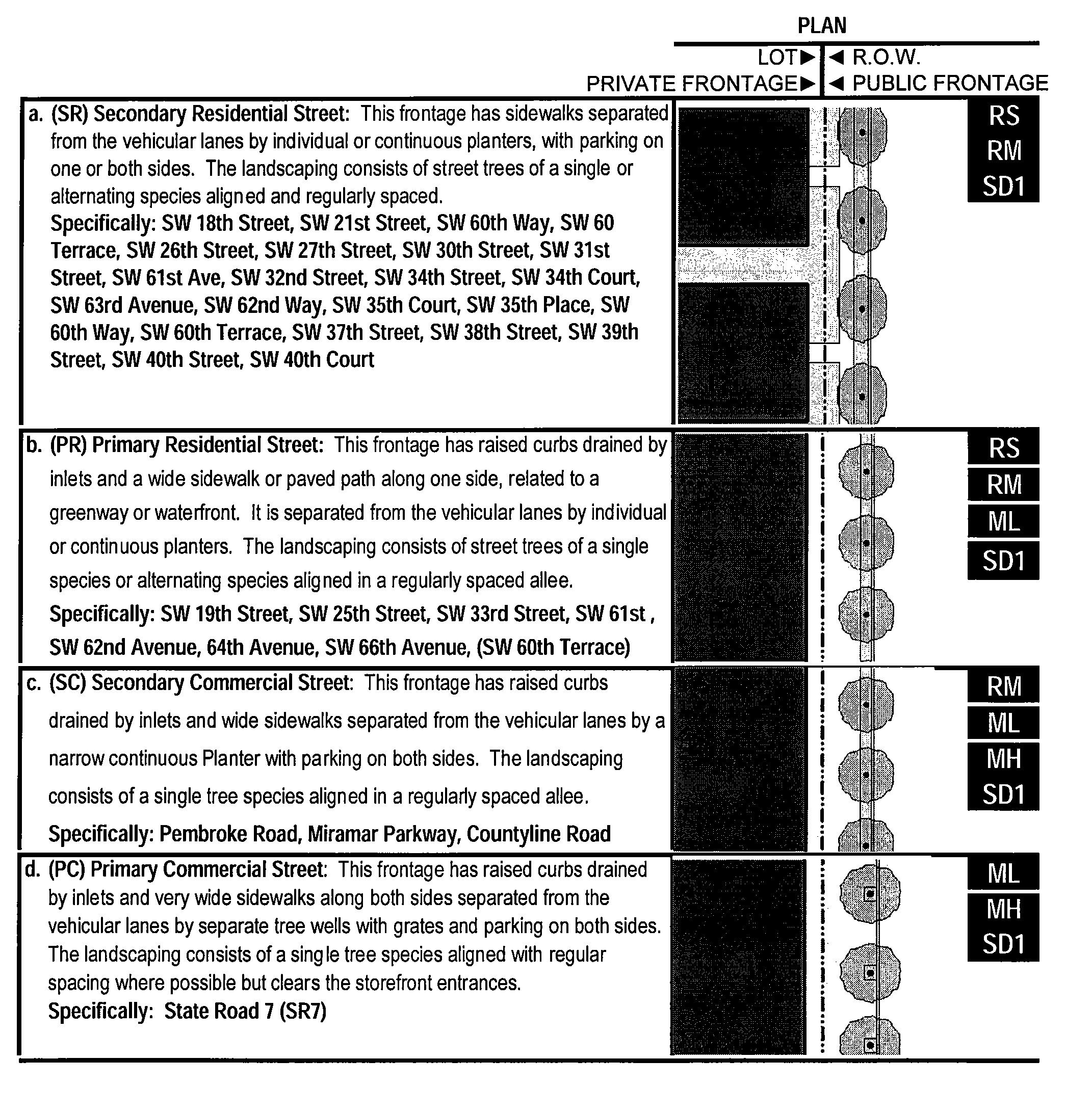 712.3. SR-7 Overlay District Boundaries. The SR-7 Overlay District is bounded by Pembroke Road to the north, SR-7 to the east, County Line Road to the south and SW 62 Avenue to the west. The SR-7 Overlay District contains two sub-districts, the commercially-zoned properties and the remainder of the district or the residentially-zoned properties. Commercial properties fronting on primary and secondary streets within the district may be developed at the minimum front yard and lot area and at the base land use density listed in Table 1. The remainder of the SR-7 Overlay District is constrained to modest density residential use.