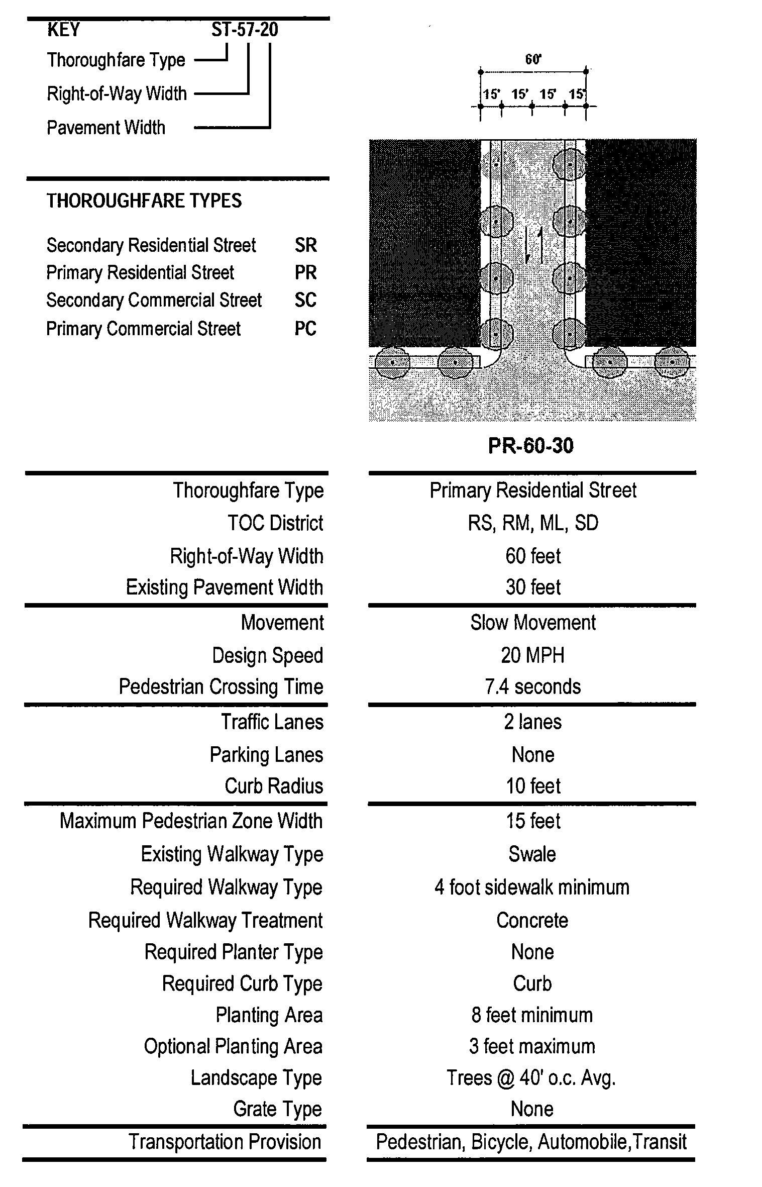 Table 2F: Thoroughfare Assemblies. These thoroughfares are assembled from the elements that incorporate the public frontages of Table 2A. The key gives the Thoroughfare type followed by the right-of-way width, followed by the pavement width, and in some instances followed by specialized transportation capability.