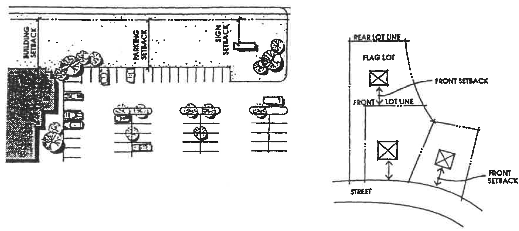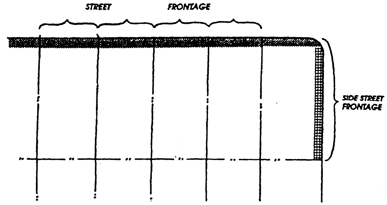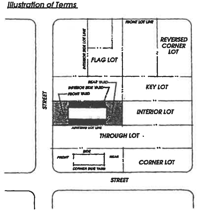 Setback. The required distance that a structure must be located from a lot line. On corner lots, the shortest street frontage shall be the front yard in residential zoning districts, while the longest street frontage shall be the front yard in commercial/industrial zoning districts. On flag lots, the rear yard location shall be determined through project review.