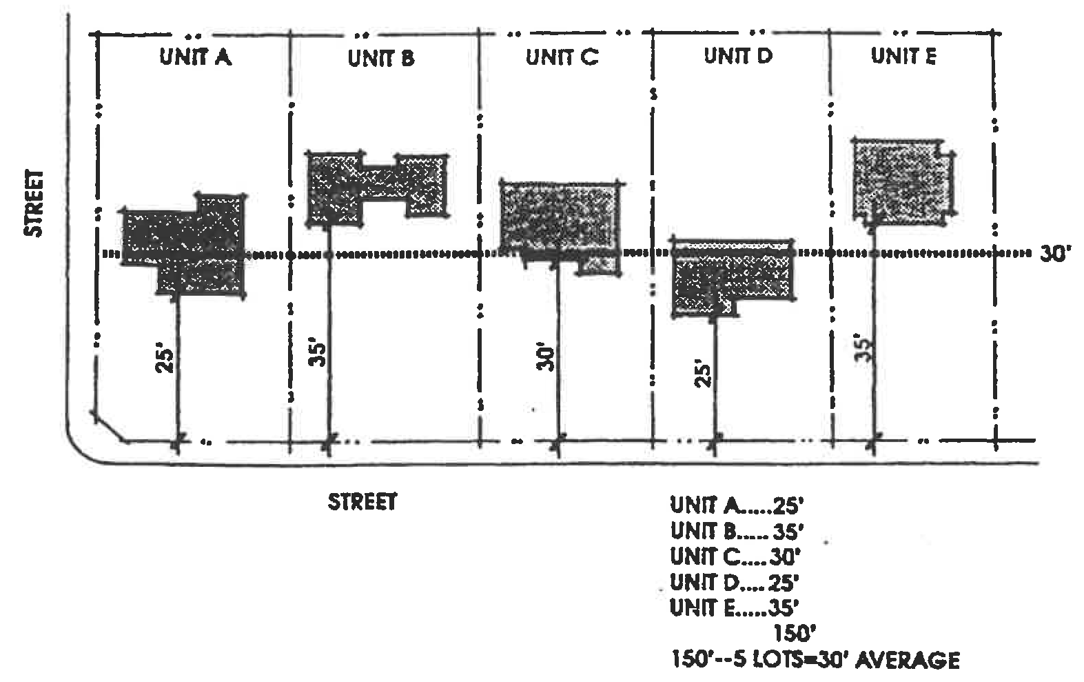 Setback, front/rear average. The average front/rear yard setback of a group of five adjacent dwelling units. The setback on any unit may vary up to ten feet as long as the average setback of all five units equals the minimum required for the zoning district.