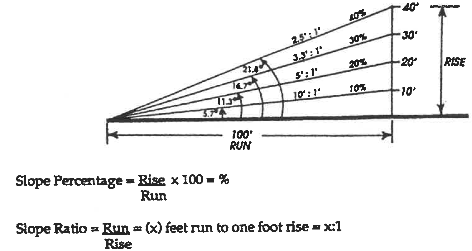 Slope. A hillside; the degree of deviation of a surface from the horizontal, usually expressed in percent or degrees.