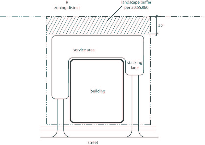 Service areas and stacking lanes on parcels abutting R zoning districts must be set back at least 50 feet and landscaped in accordance with the landscape buffer requirements of 20.65.060.