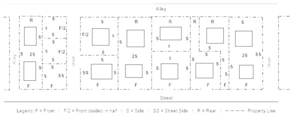 Front setbacks are measured from the front property line to the closest point of the building or structure. Through parcels must have a front setback on both opposing sides of the parcel. For purpose of this provision, the front property line is the property line that "faces" and is adjacent to the street. On corner parcels, the front property line is the property line that is parallel to the alley that serves the parcel. The street side property line is the property line that is perpendicular to the alley. When no alley exists, the zoning officer is authorized to establish the front property line and the street side property line.