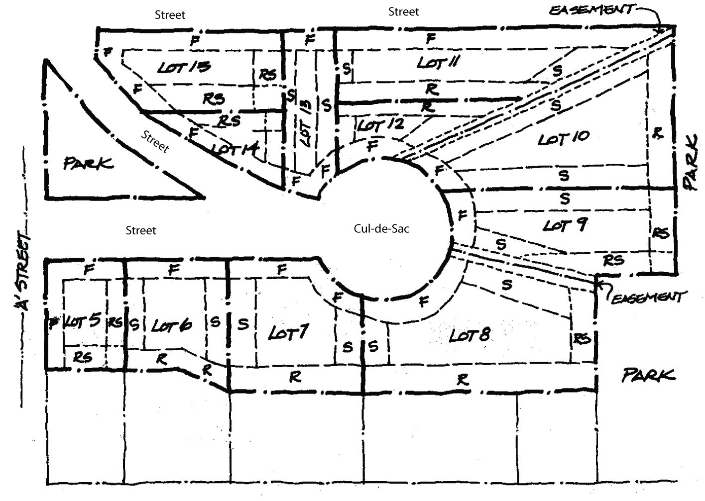 Setbacks for buildings within a TED parcel are measured to the nearest adjacent property line. A TOU separation line is not considered an adjacent property line. Depending on the design of the TED project, not every setback will apply to every TOU. (See 20.110.050.F.2 for information on TED building separation requirements.)