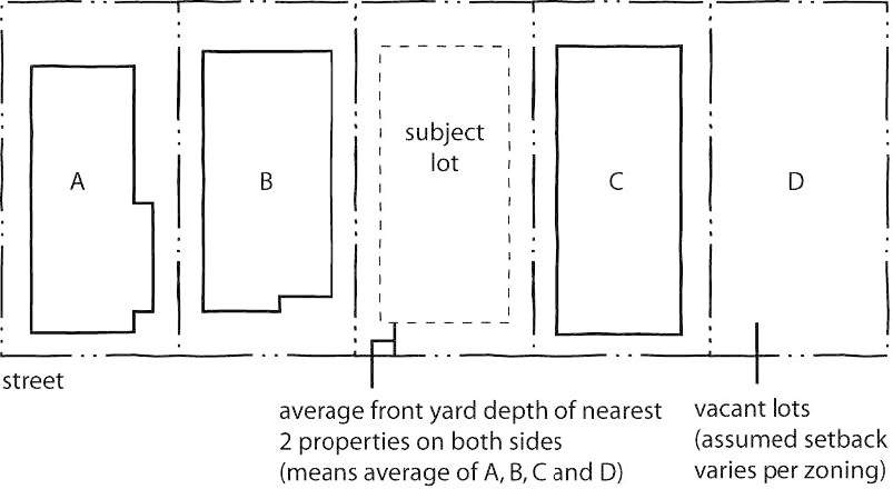 When existing lawfully establishedresidential buildings on one or more abutting parcels are closer to the front property line than the otherwise required front setback, additions to existing residential buildings or construction of new residential buildings on the subject parcel may comply with the average front yard depth that exists on the nearest two parcels on either side of the subject parcel instead of complying with the zoning district's minimum front setback requirement.