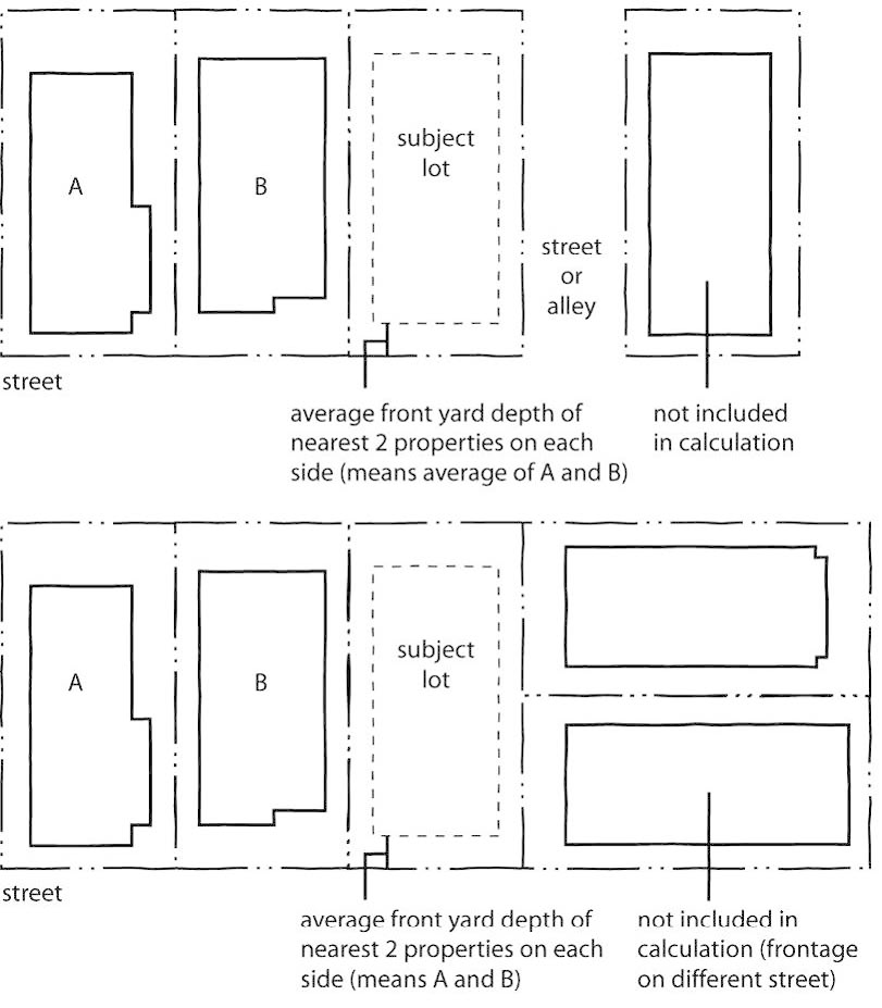 Figure 20.110-3 Setbacks, Front Setbacks, Exceptions, Averaging Calculation Scenario