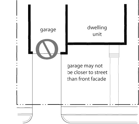 All residential garages that are accessed from the street must be set back at least 20 feet and may not be located closer to the street than the front façade of the residential building.