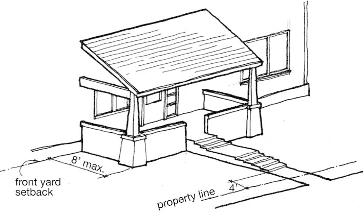 Open porches or decks, excluding steps, may project into the front setback by up to eight feet. The porch, deck, and steps must be set back at least four feet from all property lines.