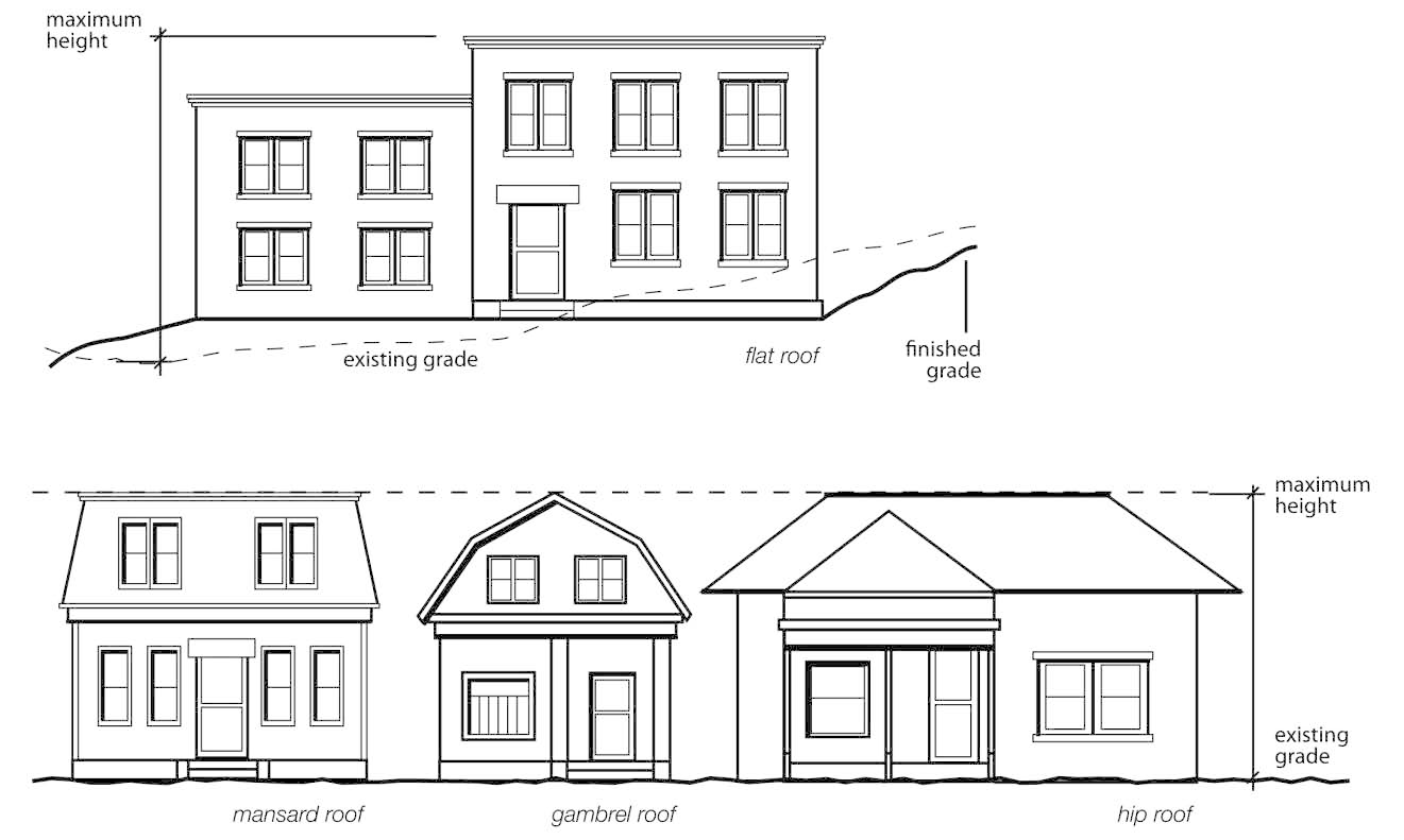 Building height is measured as the vertical distance from the lowest point where the building line meets existing grade to the highest point of the subject building. The highest point of the building is the coping of a flat roof, the top of a mansard roof or shed roof, or the peak of the highest gable of a gambrel or hip roof.