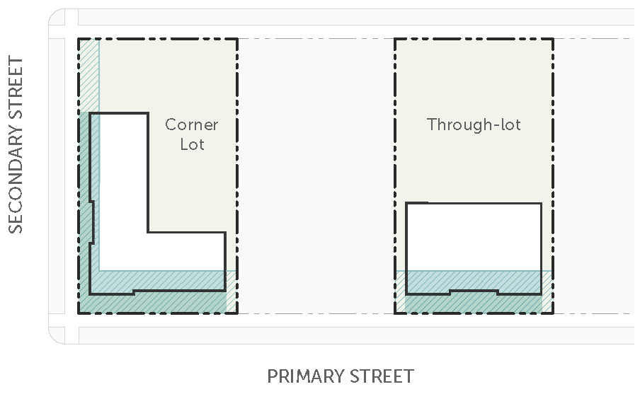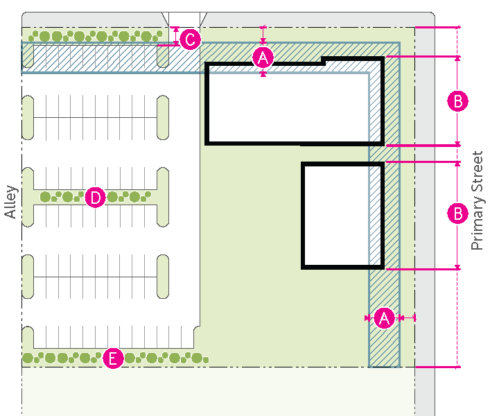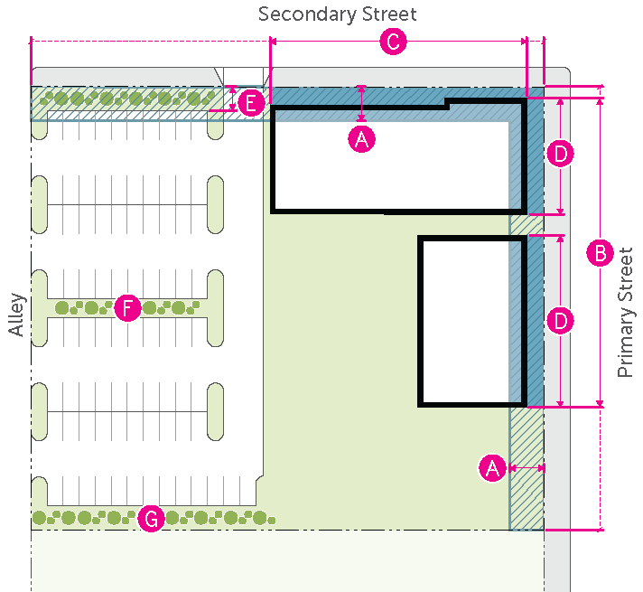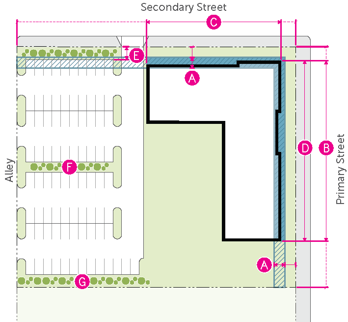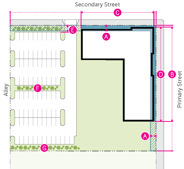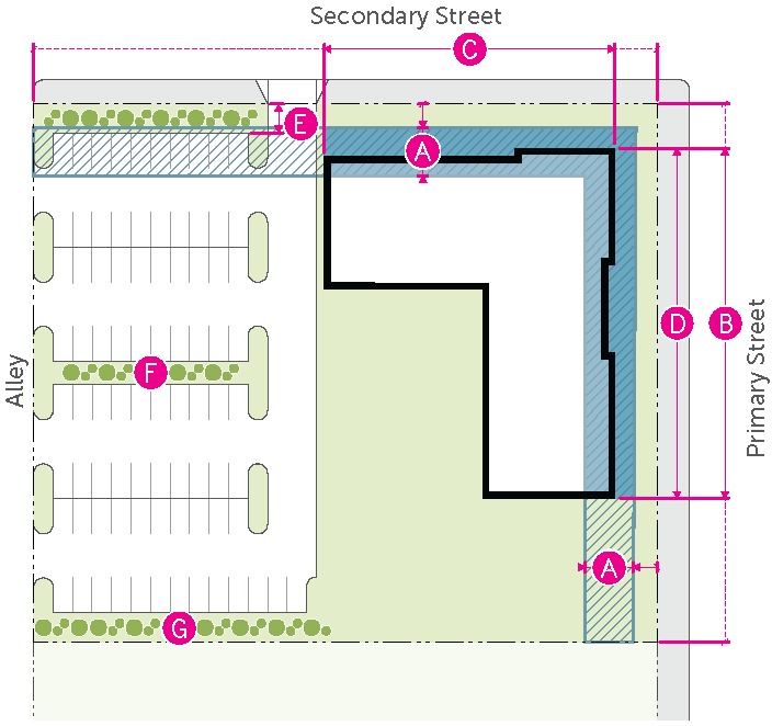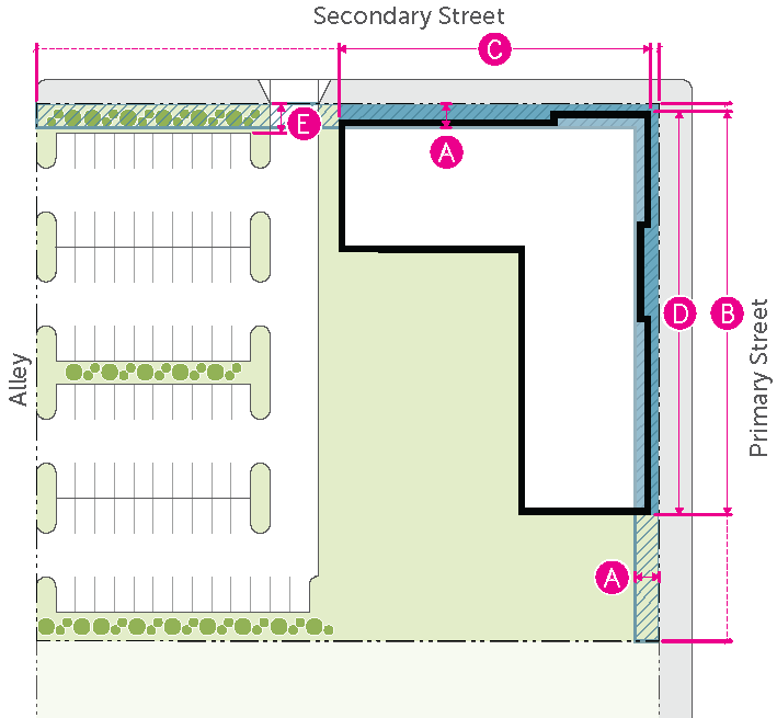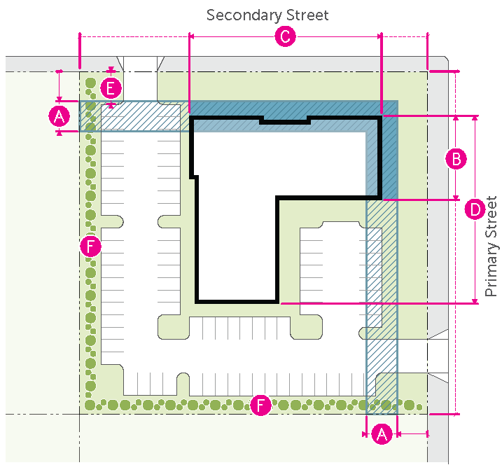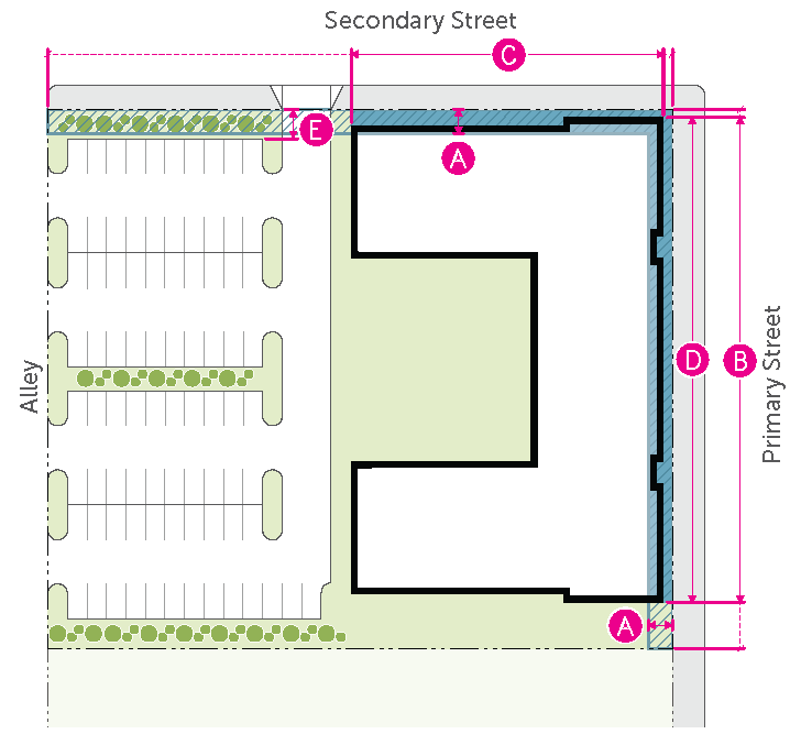 Figure 20.25-1 /P, Pedestrian Overlay, Building Placement, Corner Parcels