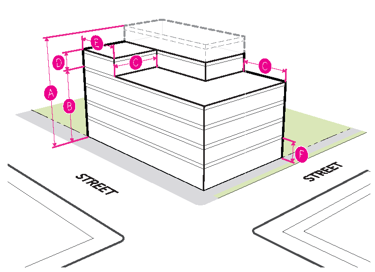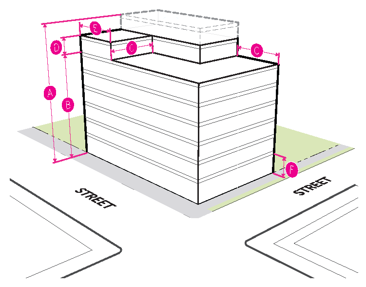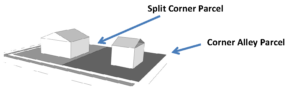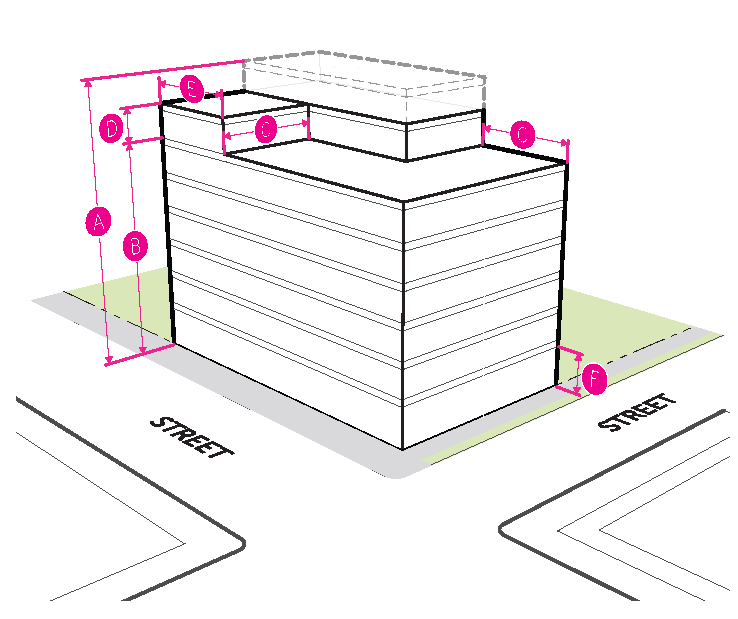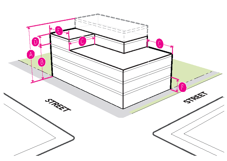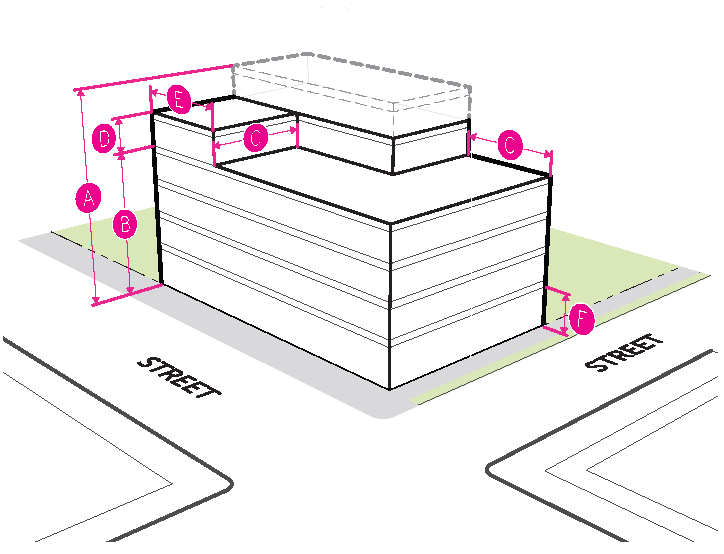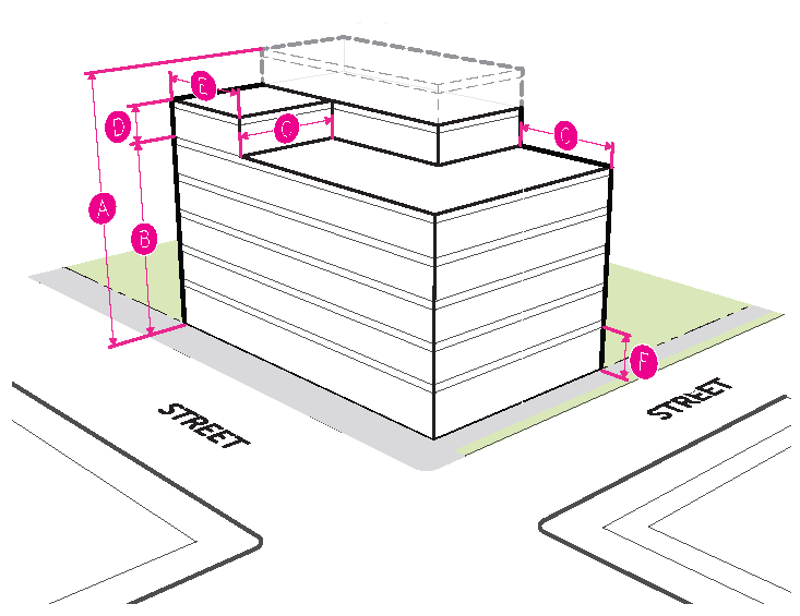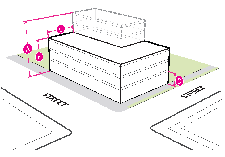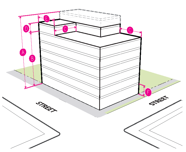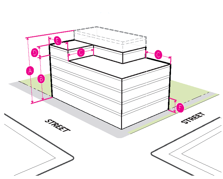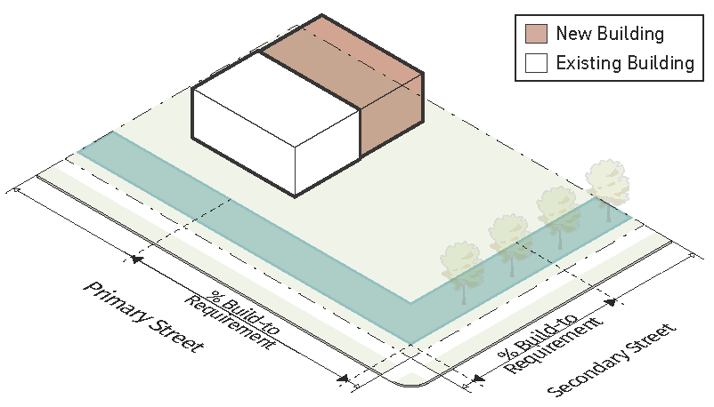 Figure 20.25-1 /P, Pedestrian Overlay, Building Placement, Corner Parcels