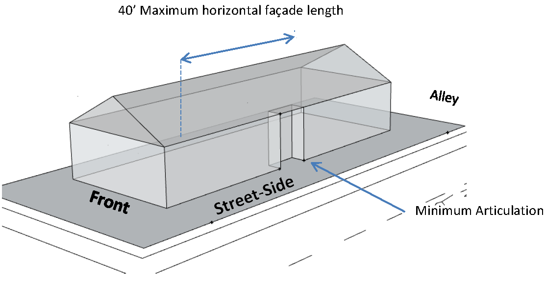 fluctuation in front setback is encouraged. Parking should be shared among multiple buildings wherever possible. High levels of transparency and detailing are promoted at the