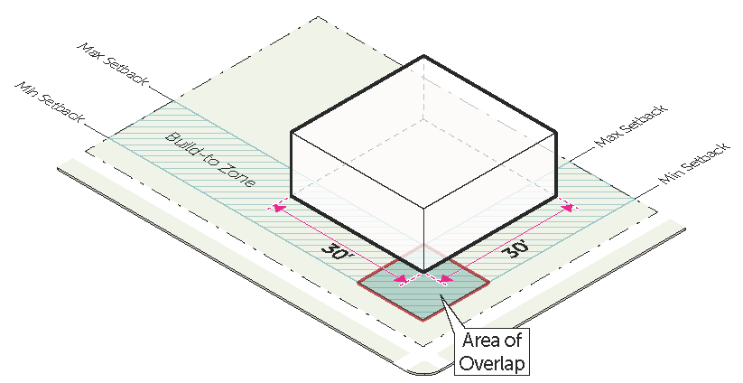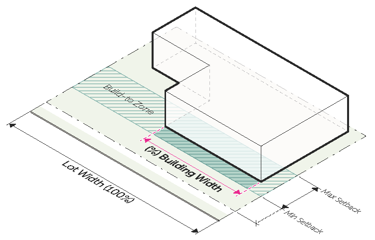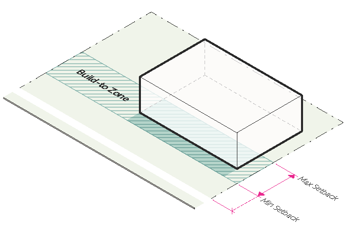 should be minimized to provide a highly walkable street edge. Buildings are oriented to the street, but building placement flexibility is promoted. Sets