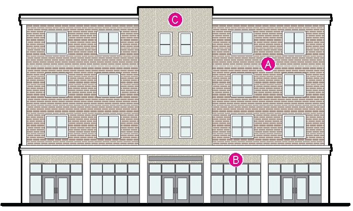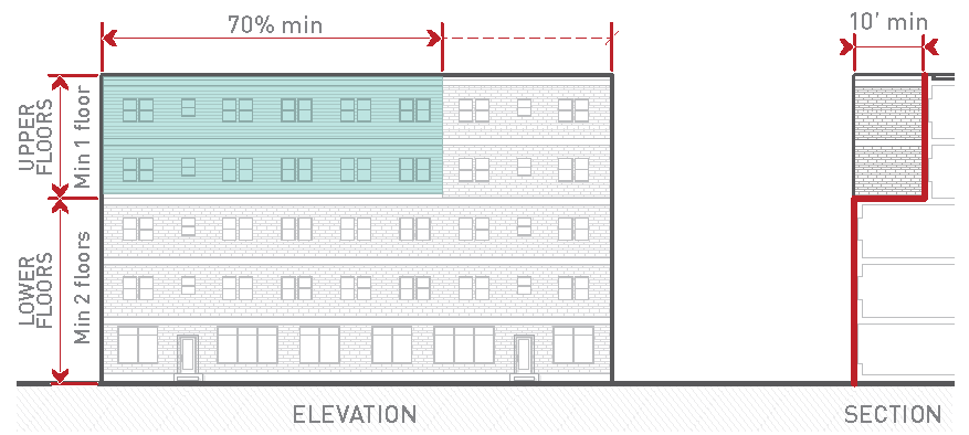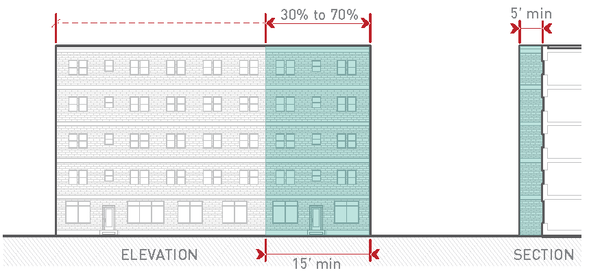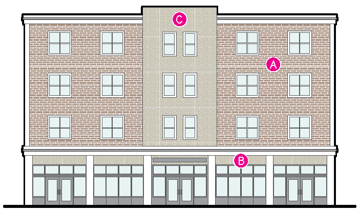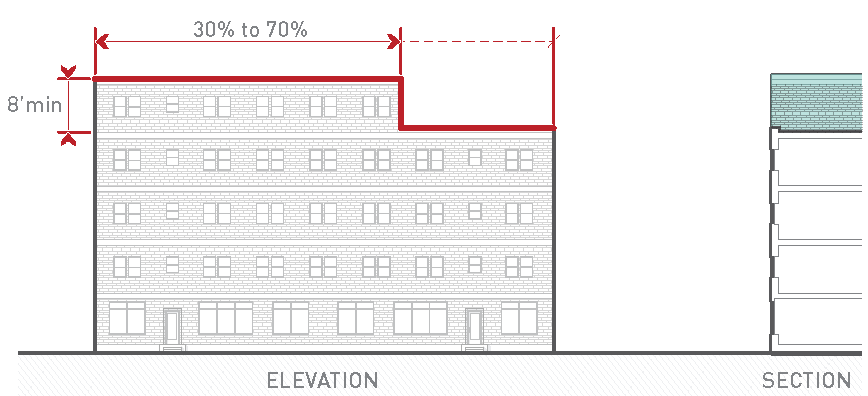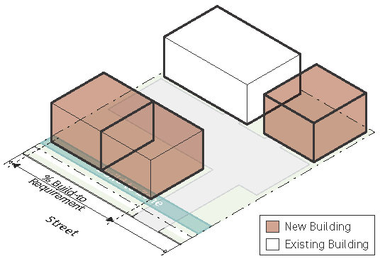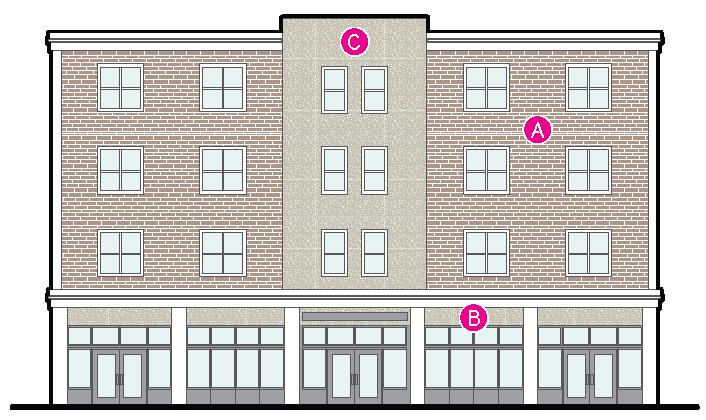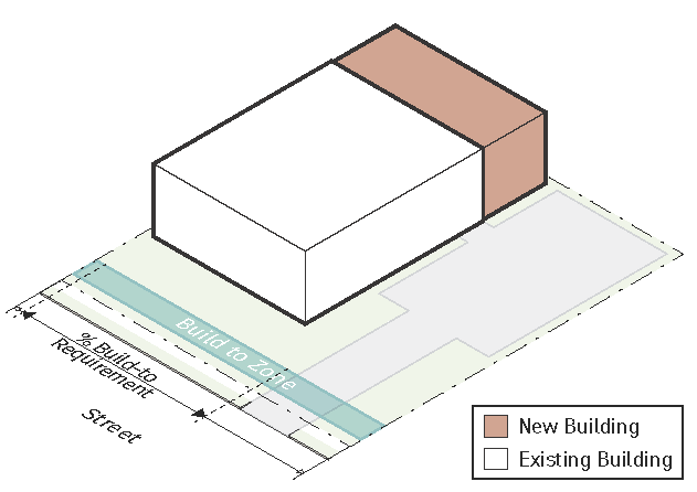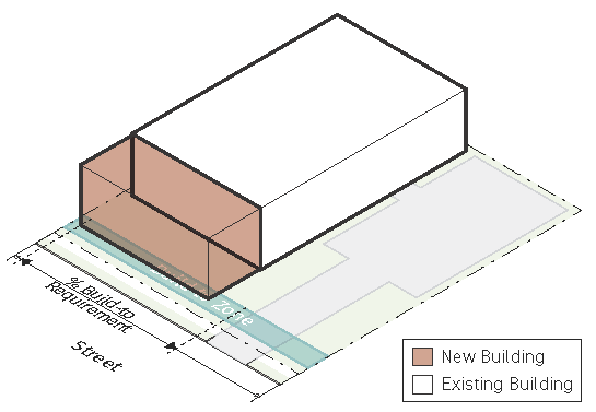 should be heavily emphasized. Mid-rise development is encouraged. Buildings are located to tightly frame the street with a consistent street wall, but some minor