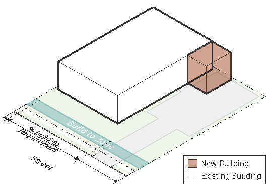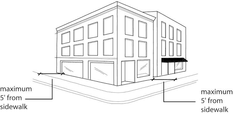 Buildings must abut the sidewalk or be located within five feet of the sidewalk for at least 60% of the property line along the primary street frontage and for at least 40% of the property line along the secondary (side) street frontage. For the purpose of this provision, the "primary street frontage" is the frontage abutting the street that has the longest length of street frontage classified in the /P overlay district. "Secondary street frontages" exist along those streets that intersect the primary street.