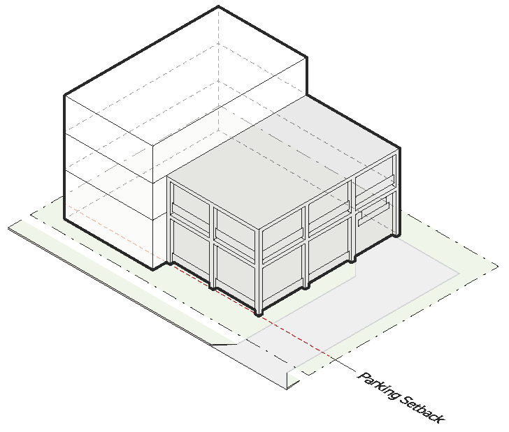 and lower scale at the street edge to help them fit in. The visual impact of parking