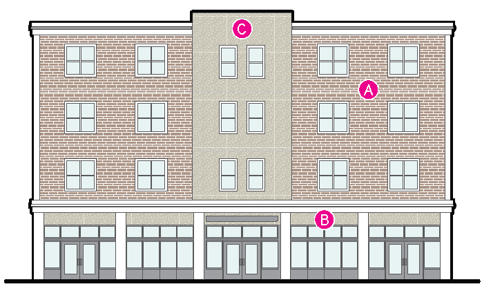 Building entrances may include doors to individual shops or businesses, lobby entrances, entrances to pedestrian-oriented plazas or courtyard entrances to a cluster of shops or businesses.