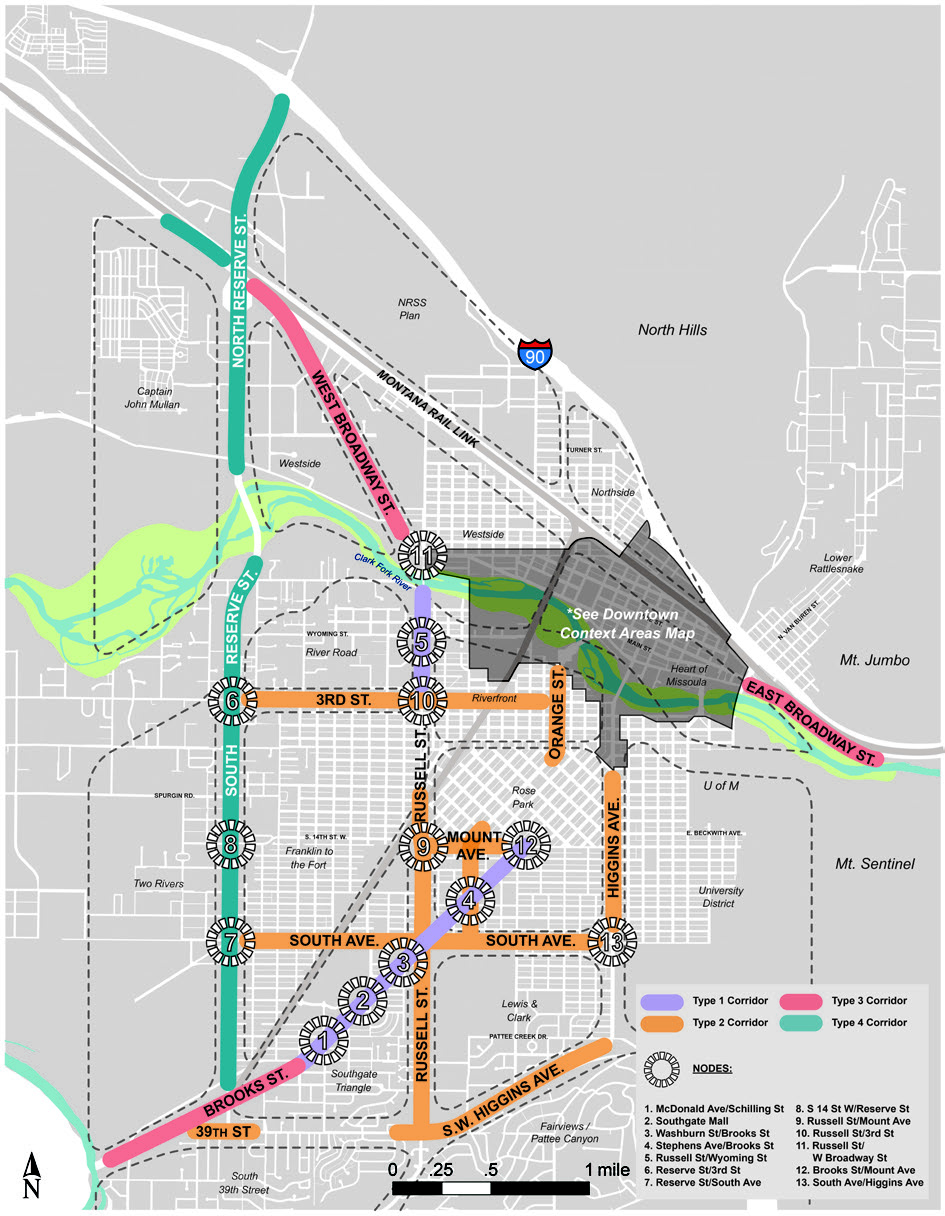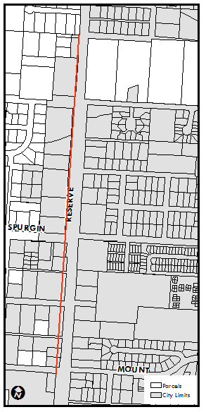 In Corridor Typology 4, due to irregular right-of-way, the setback along the west side of Reserve Street generally from Mount Street and South 5th Street