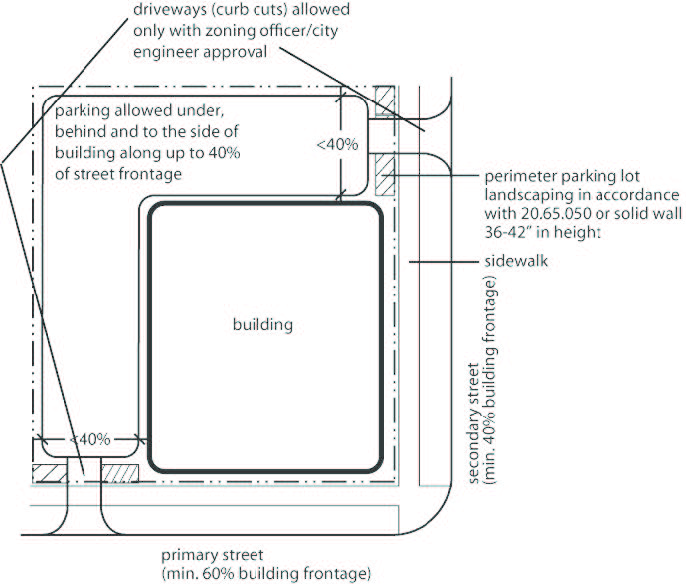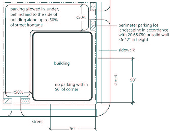 When the depth of the parcel is insufficient to permit required parking to the rear of the building, parking may be located to the side of the building, provided that it does not occupy more than 40% of the street frontage and it is separated from the sidewalk by perimeter parking lot landscaping in accordance with 20.65.050. If the parking lot perimeter landscaping requirements of 20.65.050 do not apply, the parking must be separated from the sidewalk by a solid wall between 36 and 42 inches in height.