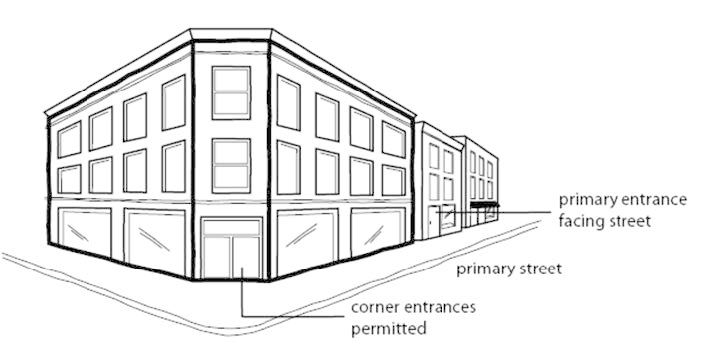 Buildings must have a working public entrance facing the primary street. Entrances at building corners may be used to satisfy this requirement.