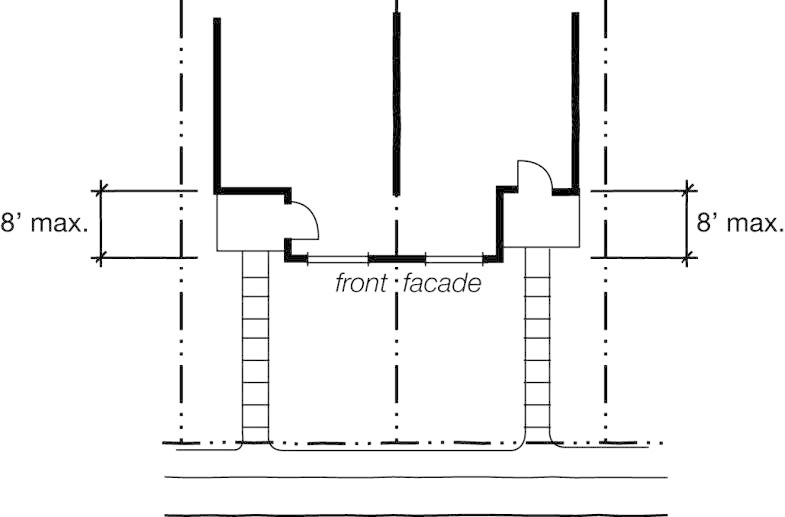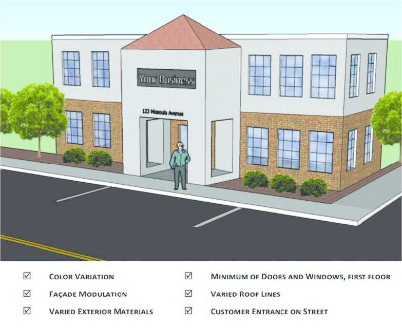 This requirement applies to all new construction and when the floor area of an existing building is expanded by 50% or more in order to reduce its apparent bulk. Building walls that contain public building entrances and building walls that face public rights-of-way must incorporate at least three of the following features: