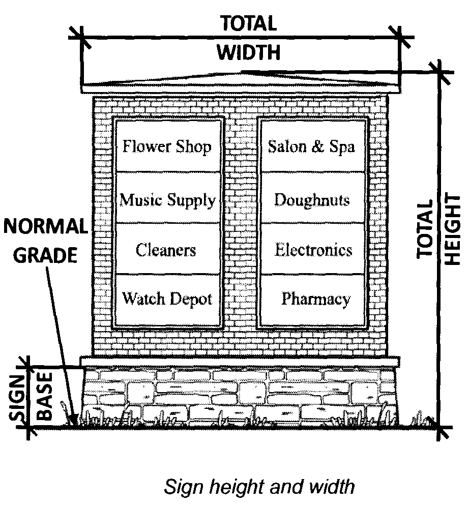 Computation of sign height. The height of a monument sign shall be computed as the distance from the bottom of the sign base of the sign at normal grade to the top of the highest attached component of the sign. The height of all other signs, except for wall signs, shall be computed as the distance from the bottom of the sign structure at normal grade to the top of the highest component of the sign structure. Normal grade shall be the lower of either (1) the existing grade prior to construction or (2) the newly established finished grade after construction, excluding any filling, berming, mounding or excavating solely for the purpose of locating the sign.