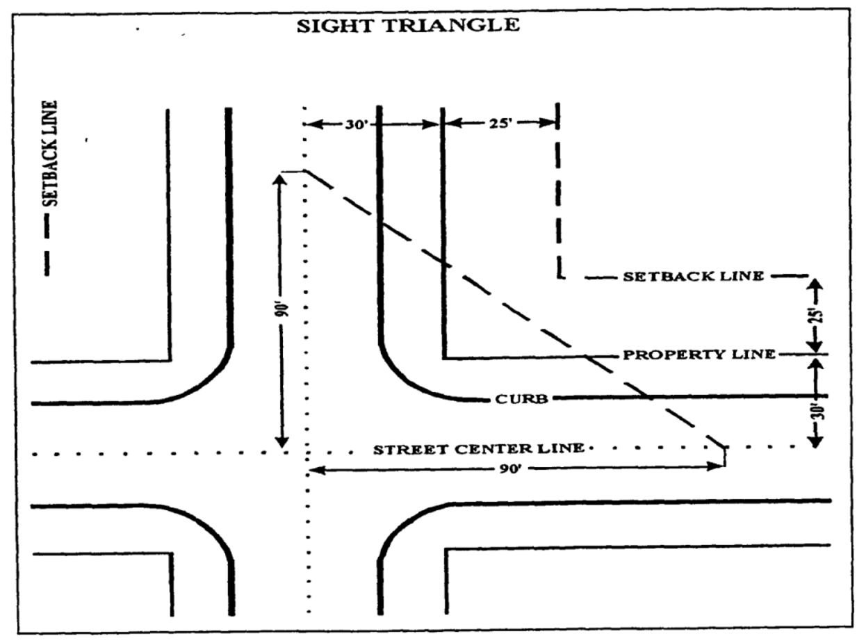 Sight triangle means an area at a street intersection in which nothing shall be erected, placed, planted, or allowed to grow in such a manner as to materially impede vision between a height of 2½ feet and eight feet above the grades of the outside edge of the street surface of the intersecting streets, measured from the point of intersection of the centerline of the streets, 90 feet in each direction along the centerline of the streets; except that, the city engineer may establish greater sight triangles based upon standards in the policy manual published by the American Association of State Highway and Transportation Officials (AASHTO).