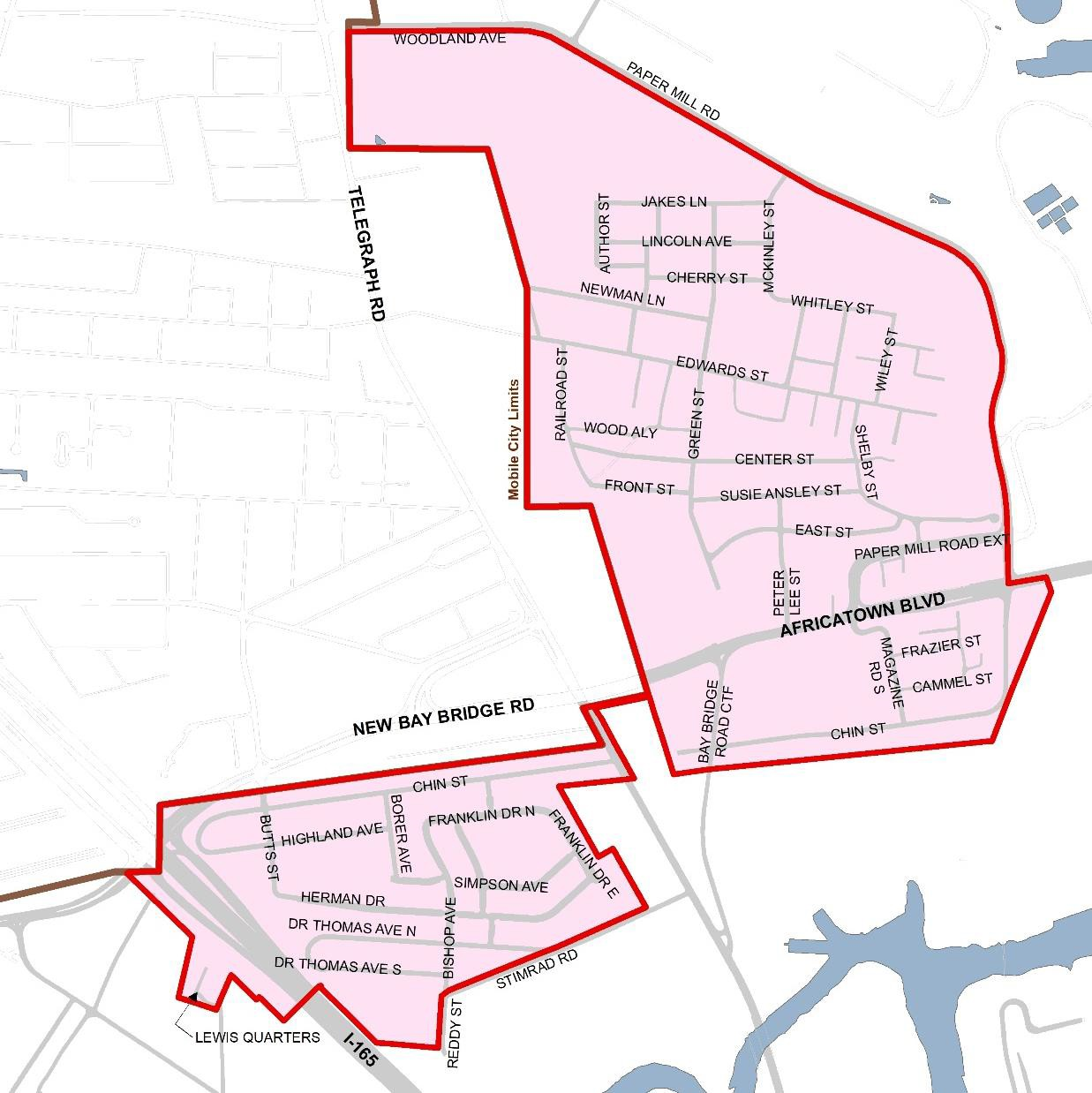 As used in this article, the Africatown Safety Zone is the area depicted on the map below being bordered roughly in the northeastern section to the east and northeast by Paper Mill Road, by Woodland Avenue on the north, by Telegraph Road on the west, Chin Street on the southeastern side, and in the southeastern section by Stimrad Road on the southeastern side, I-165 on the southwestern side, New Bay Bridge Road on the northern side and portions of Telegraph Road on the eastern side.