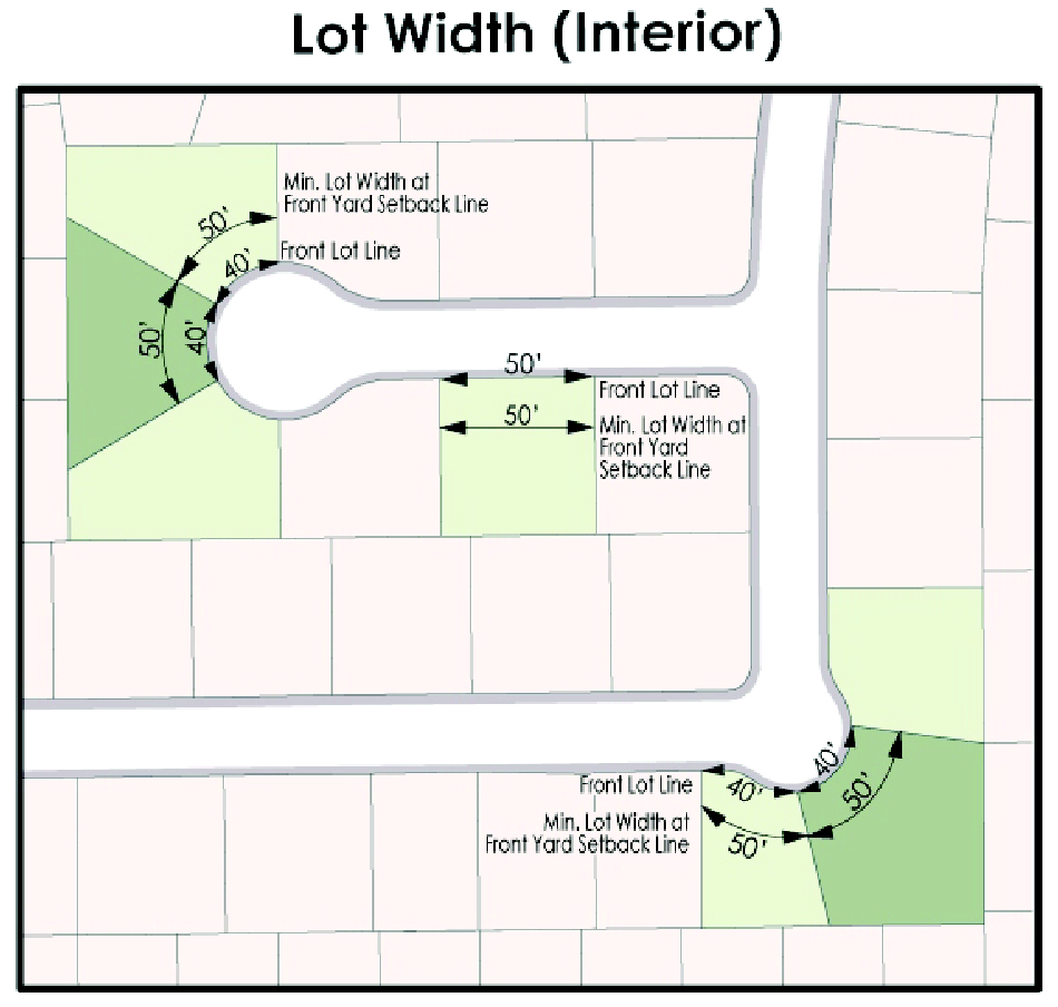 Interior lot width may be reduced to a minimum of forty (40) feet in the R-1 zone and a minimum of fifty (50) in the R-2 and R-3 zones at the front lot line where the front lot line is curved (i.e. lots on cul-de-sacs, elbows, or curvilinear streets), but the minimum width from the front setback line to the rear lot line shall be fifty (50) feet in the R-1 zone (See Figure 4.1-1) and a minimum of sixty (60) in the R-2 and R-3 zones. See Figure 4.1-1. The lot width may also be reduced as allowed in subsection (c) of this section.