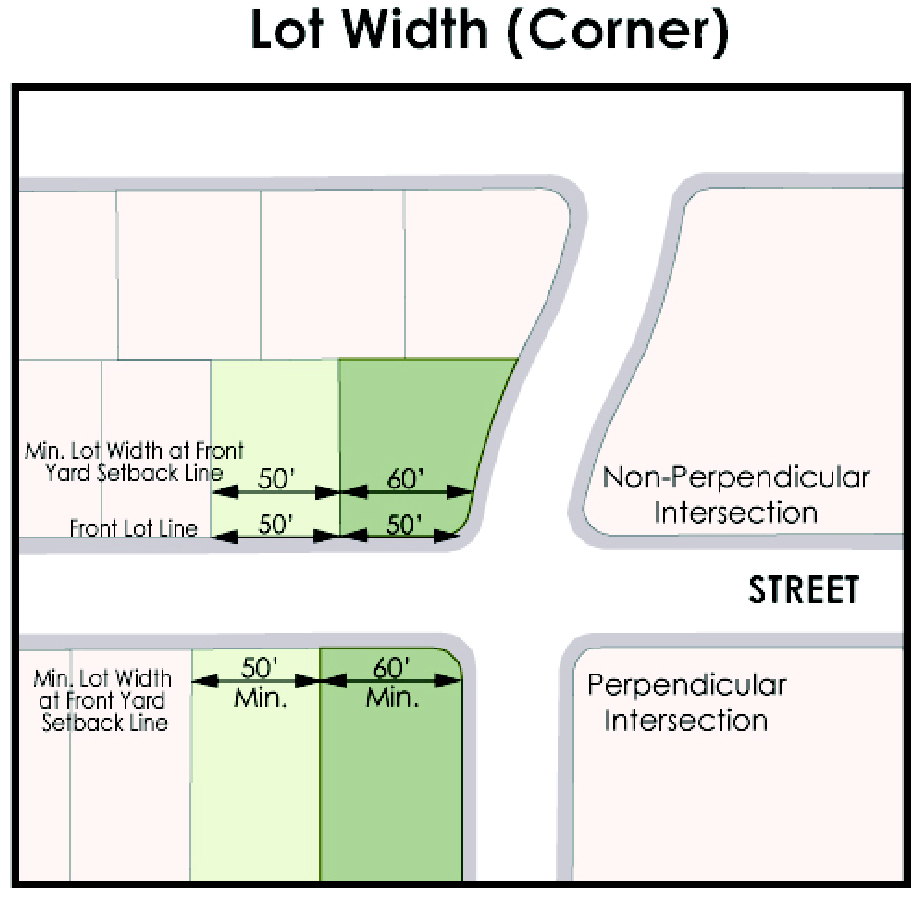 Corner lot width may be reduced to a minimum of fifty (50) feet at the front lot line in the R-1 zone for lots on non-perpendicular intersections or when the front lot line is curved, but the minimum width from the front setback line to the rear lot line shall be sixty (60) feet. See Figure 4.1-2.